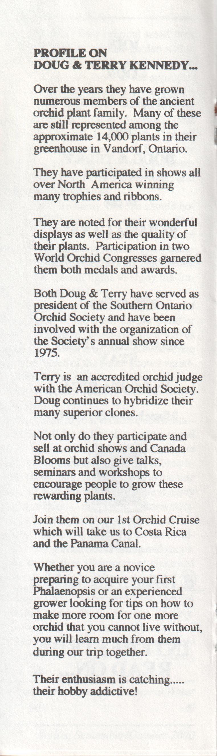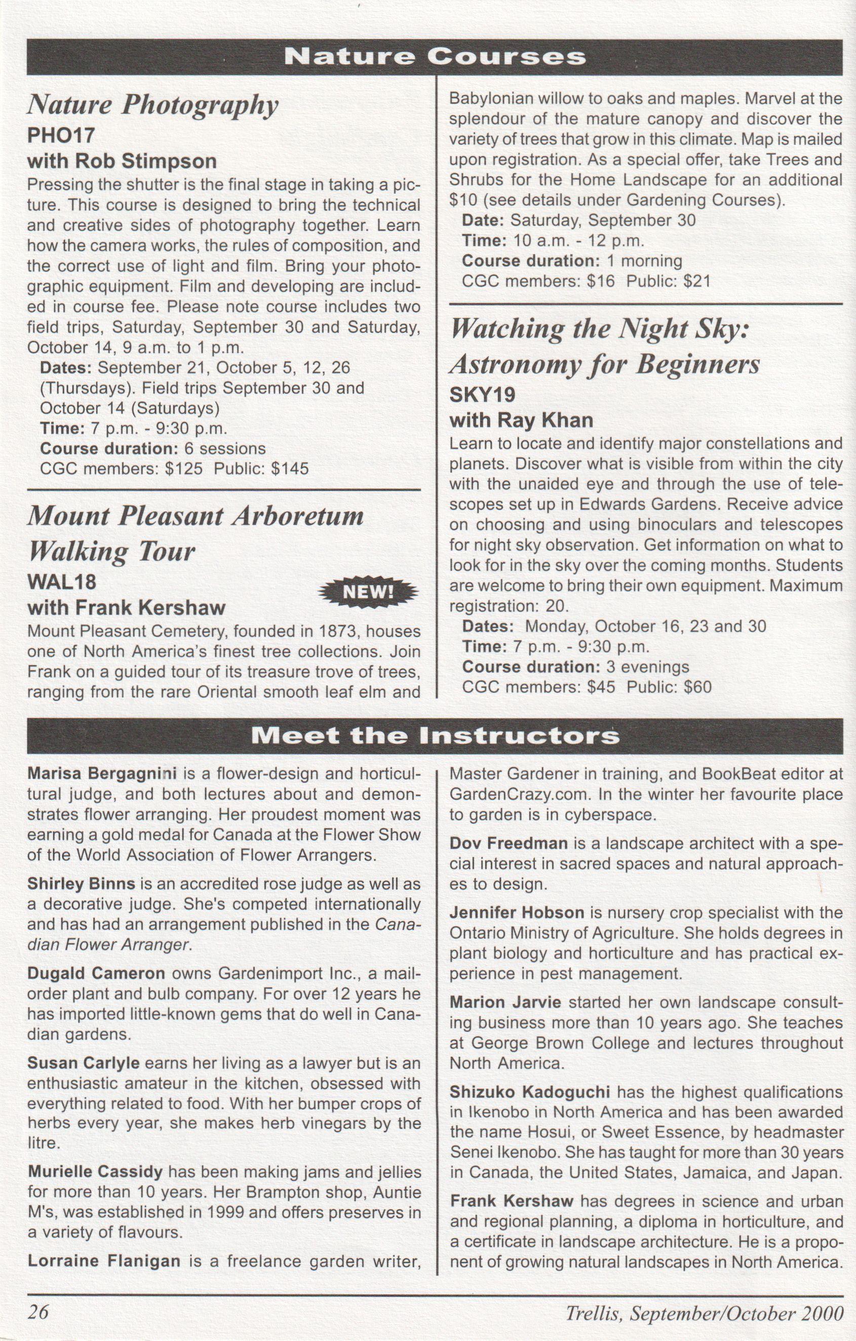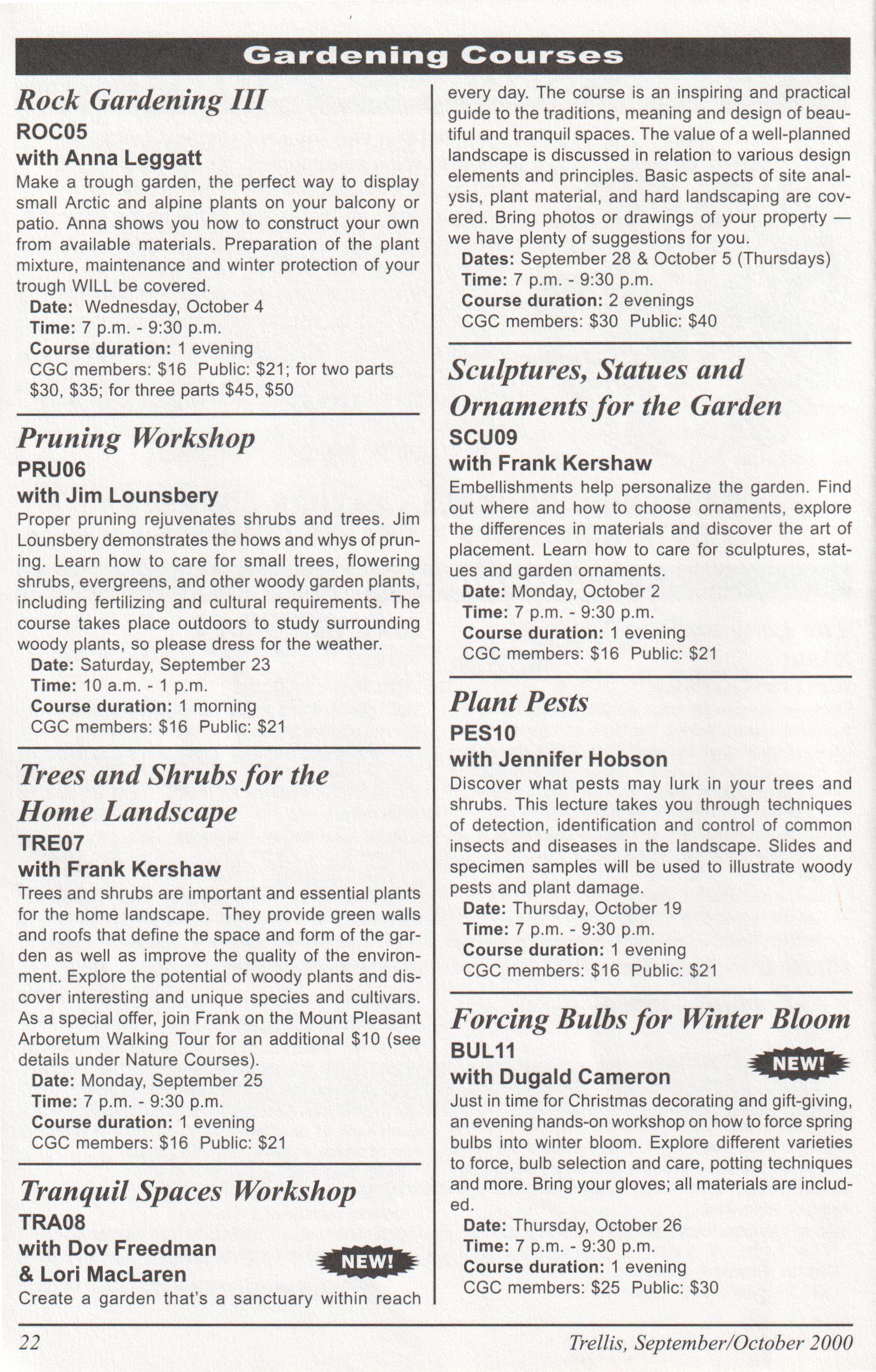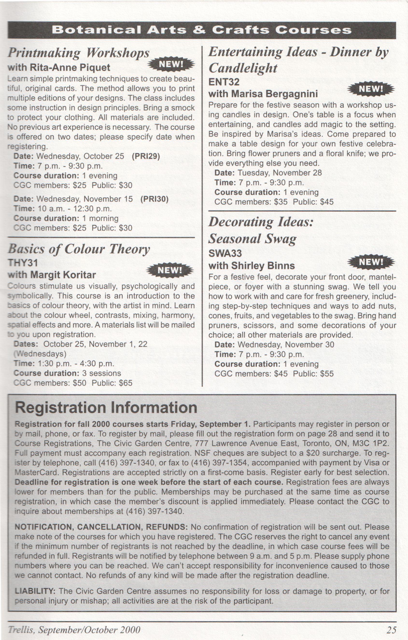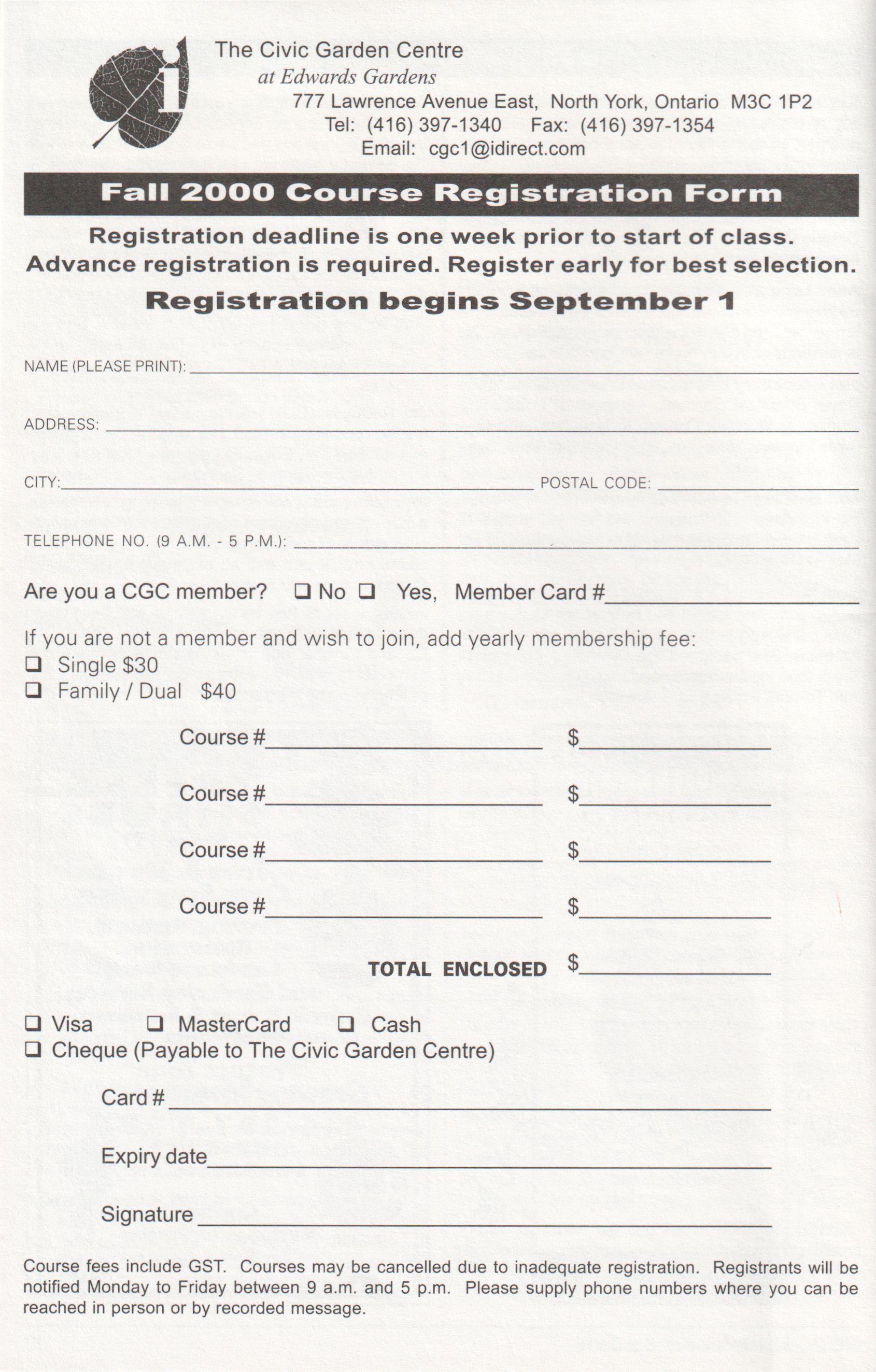 Registration for fall 2000 courses starts Friday, September 1. Participants may register in person or by mail, phone, or fax. To register by mail, please fill out the registration form on page 28 and send it to Course Registrations, The Civic Garden Centre, 777 Lawrence Avenue East, Toronto, ON, M3C 1P2. Full payment must accompany each registration. NSF cheques are subject to a $20 surcharge. To register by telephone, call (416) 397-1340, orfax to (416) 397-1354, accompanied with payment by Visa or MasterCard. Registrations are accepted strictly on a first-come basis. Register early forbest selection. Deadline for registration is one week before the start of each course. Registration fees are always lower for members than for the public. Memberships may be purchased at the same time as course registration, in which case the member s discount is applied immediately. Please contact the CGC to inquire about memberships at (416) 397-1340.