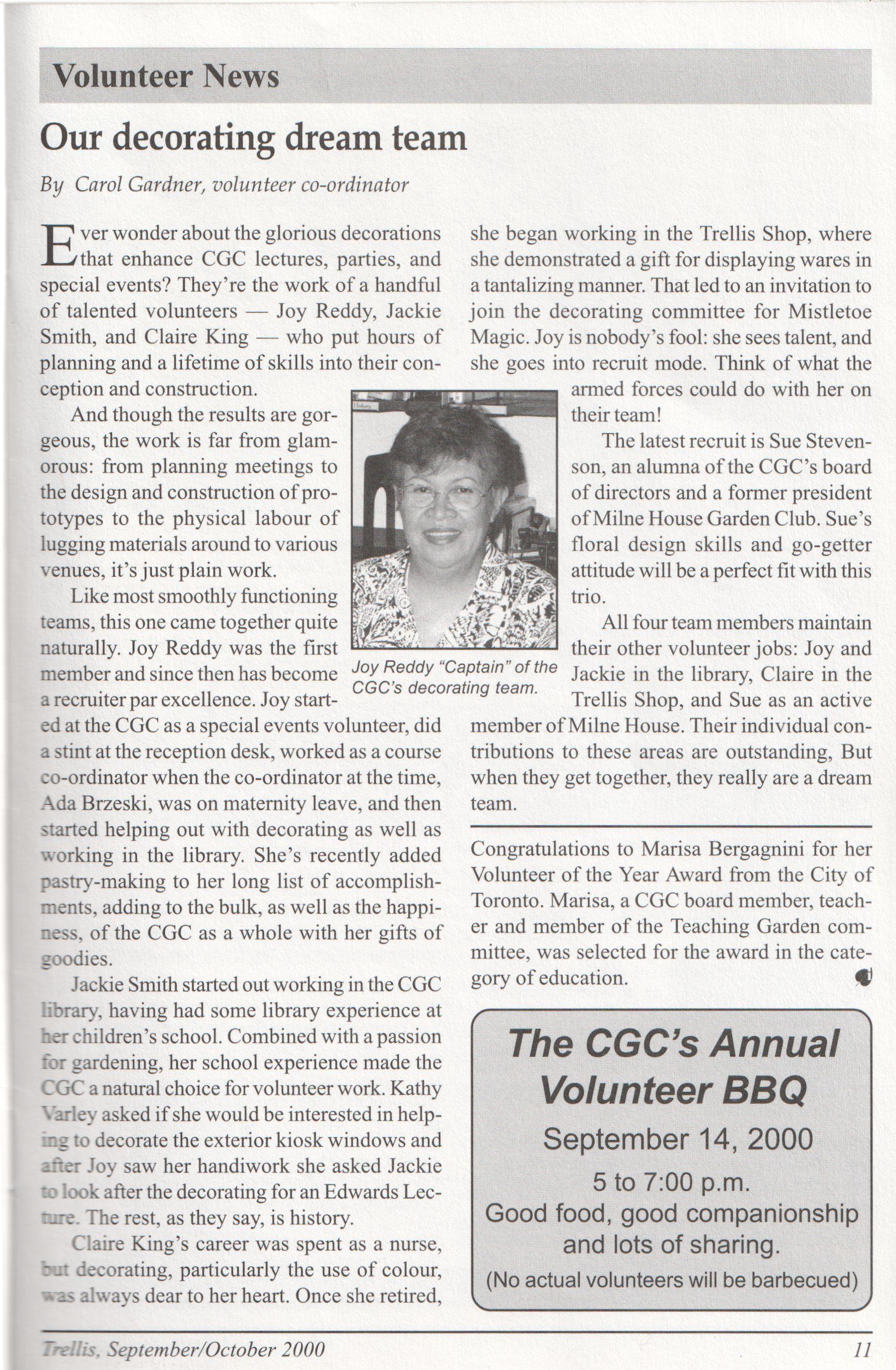 Joy Reddy is a CGC volunteerwho founded the decorating committee in 1999. Her creative designs have embellished The Edwards Lectures, Mistletoe Magic, Getting the Jump on Spring and Canada Blooms.