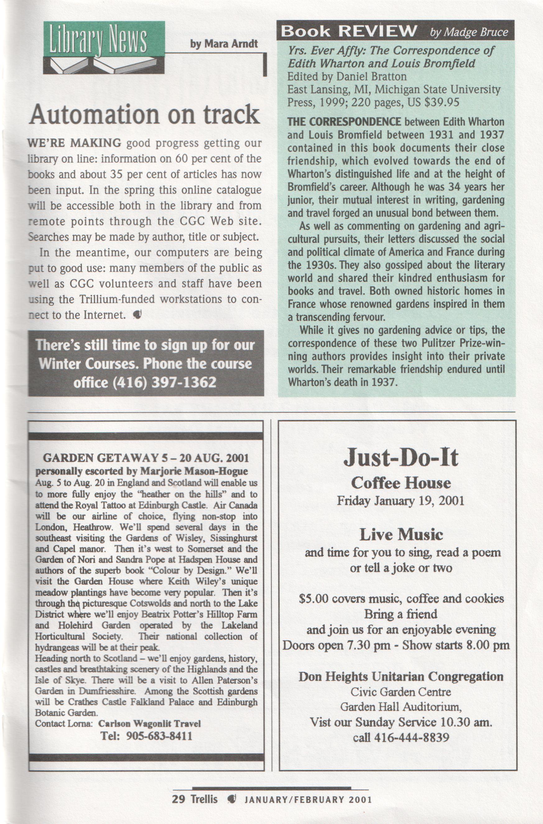 WE'RE MAKING good progress getting our oniained in this book documents their close library on line: information on 60 per cent ofthe friendship, which evolved towards the end of books and about 35 per cent of articles has now Wharton s distinguished life and at the height of been input. In the spring this online catalogue ~ Bromfield s career. Although he was 34 years her will be accessible both in the library and from junior, their mutual interest in writing, gardening | : remote points through the CGC Web site. ok Tvel 1500k W B hond ptveen the As well as commenting on gardening and agriSearches maybe made byauthor, title or subject. cultural pursuits, their letters discussed the social