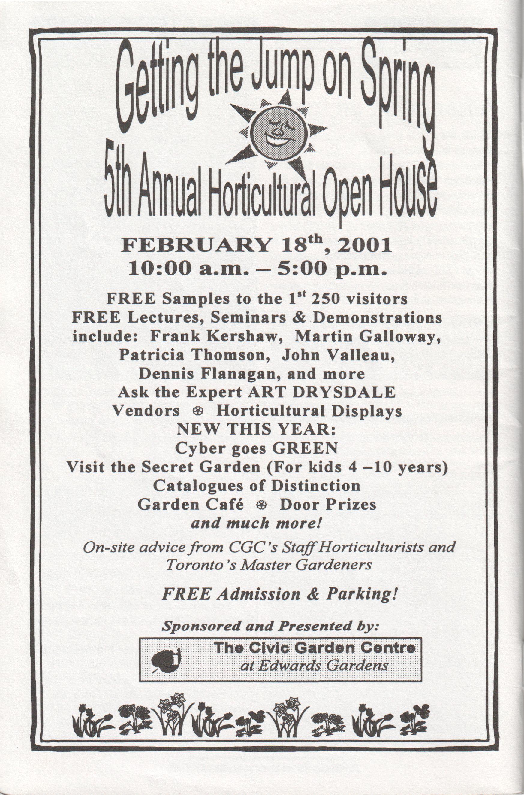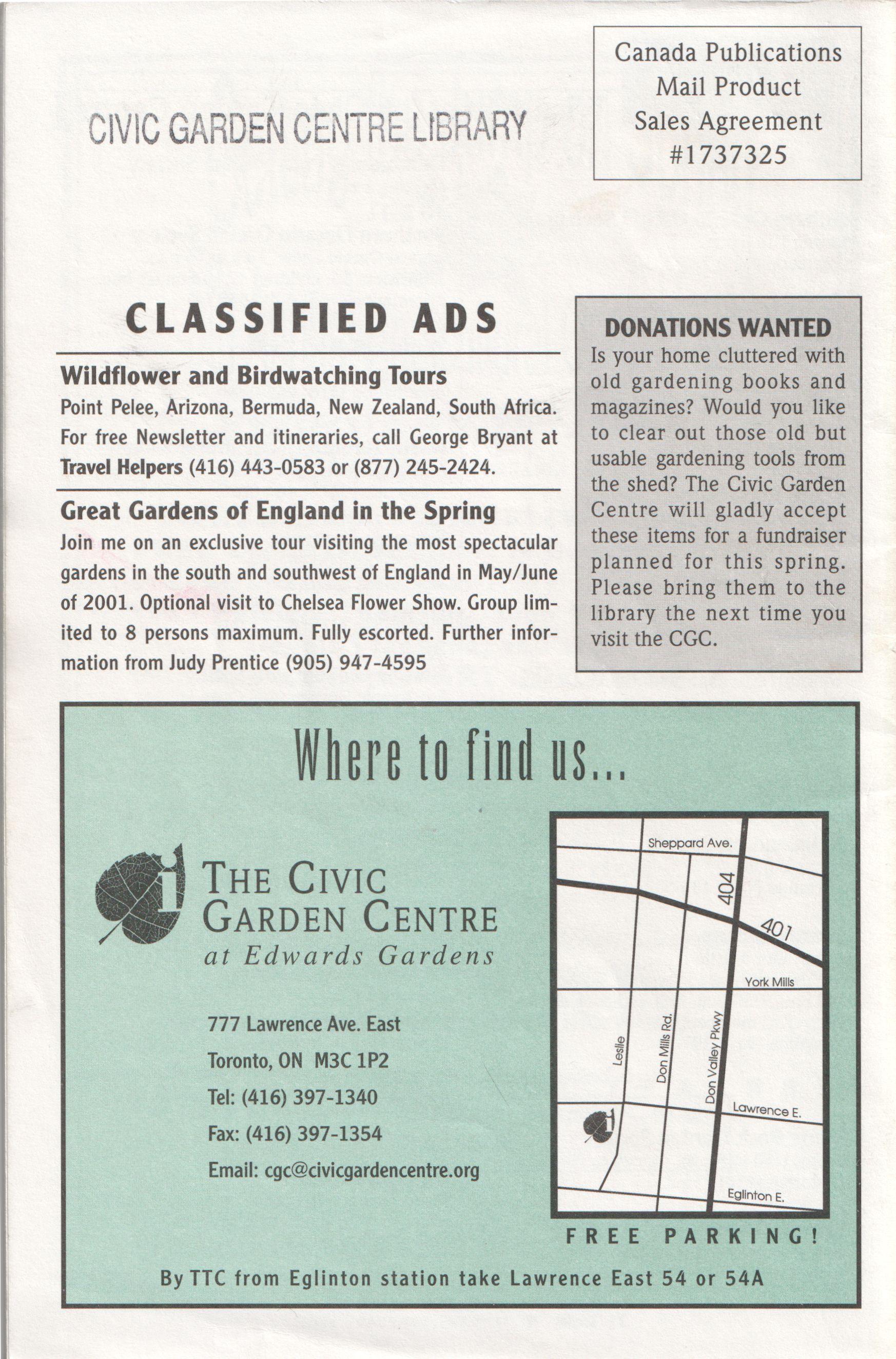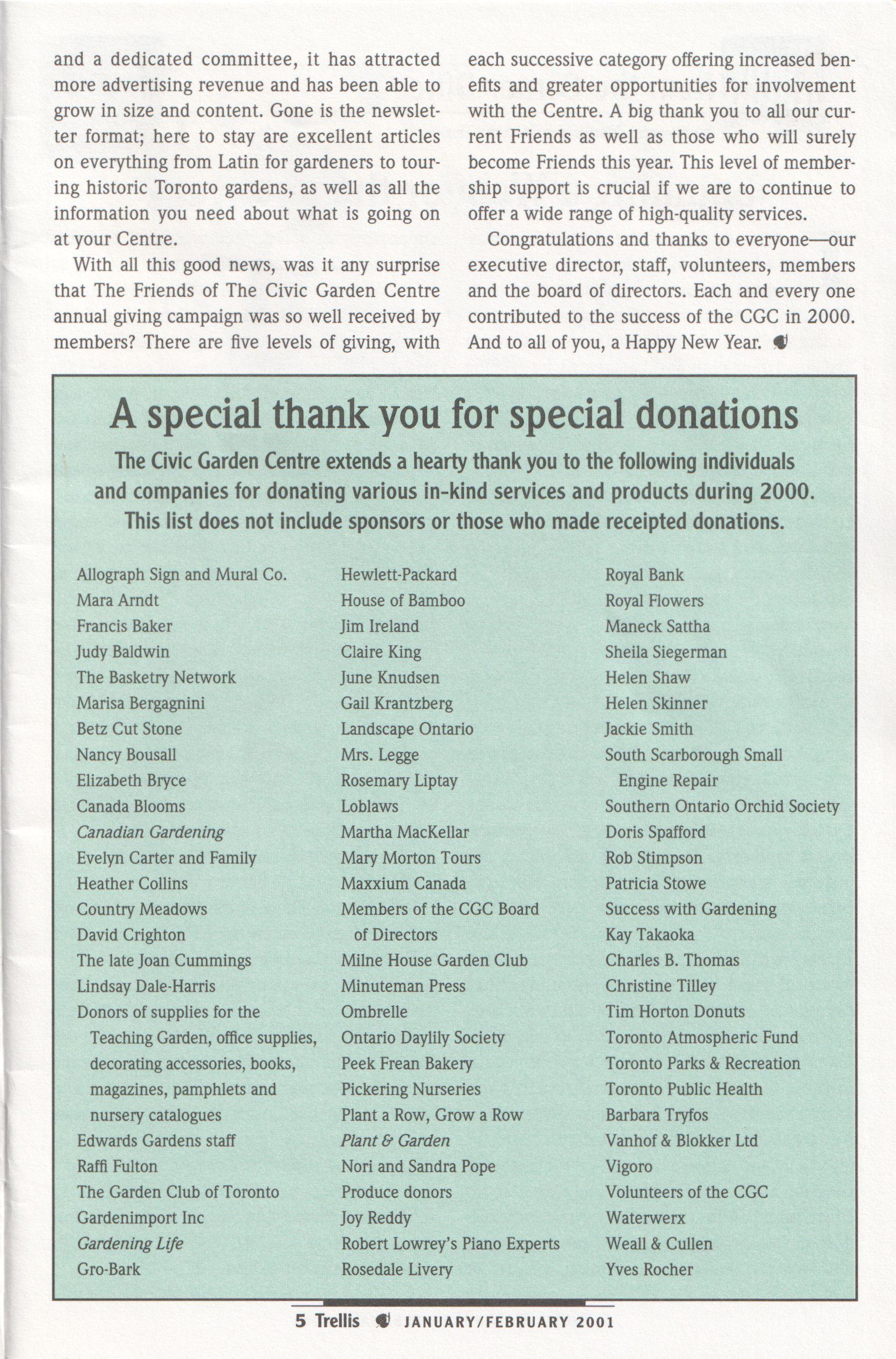 The Civic Garden Centre extends a hearty thankyou to the following individuals and companies for donating various in-kind services and products during 2000. This list does not include sponsors or those who made receipted donations.