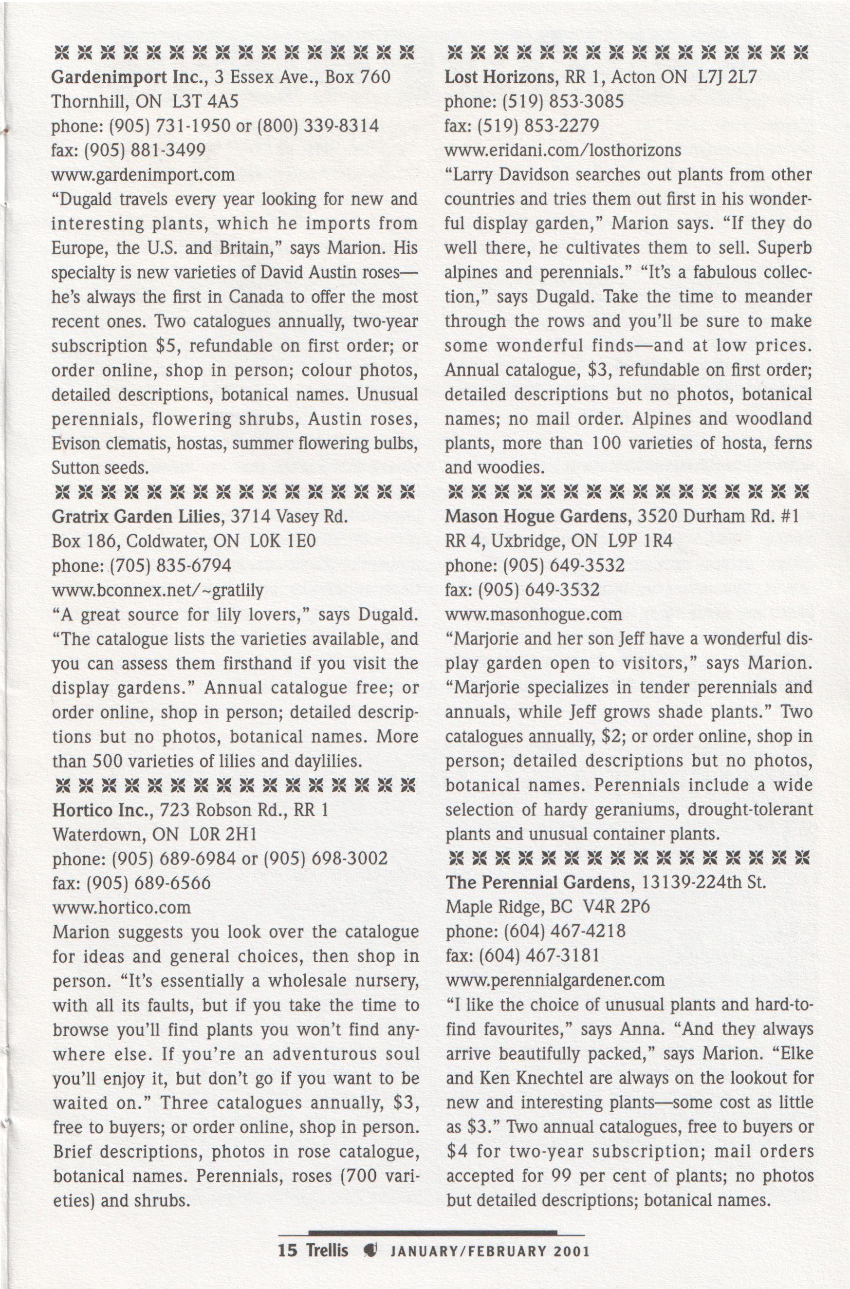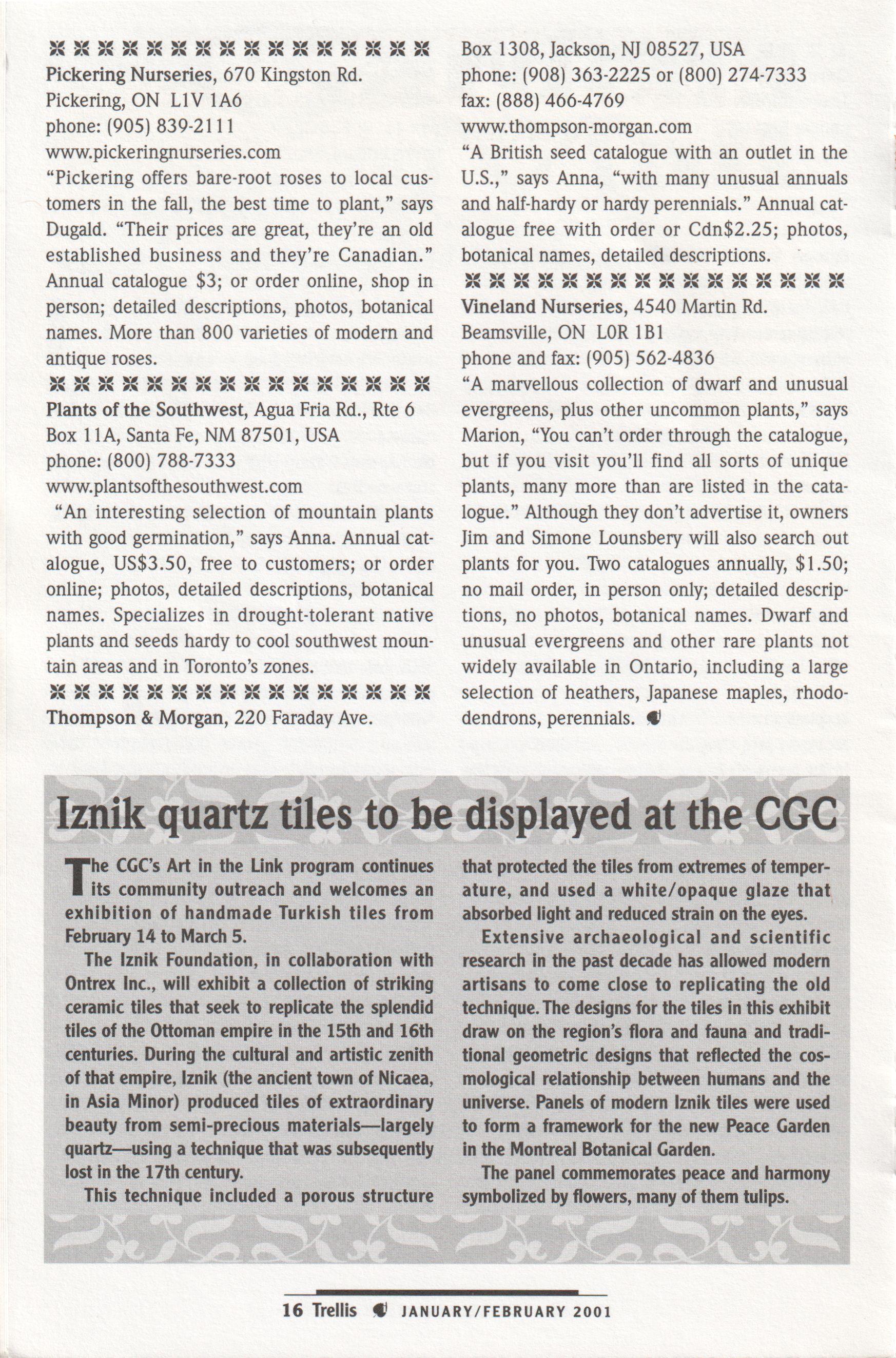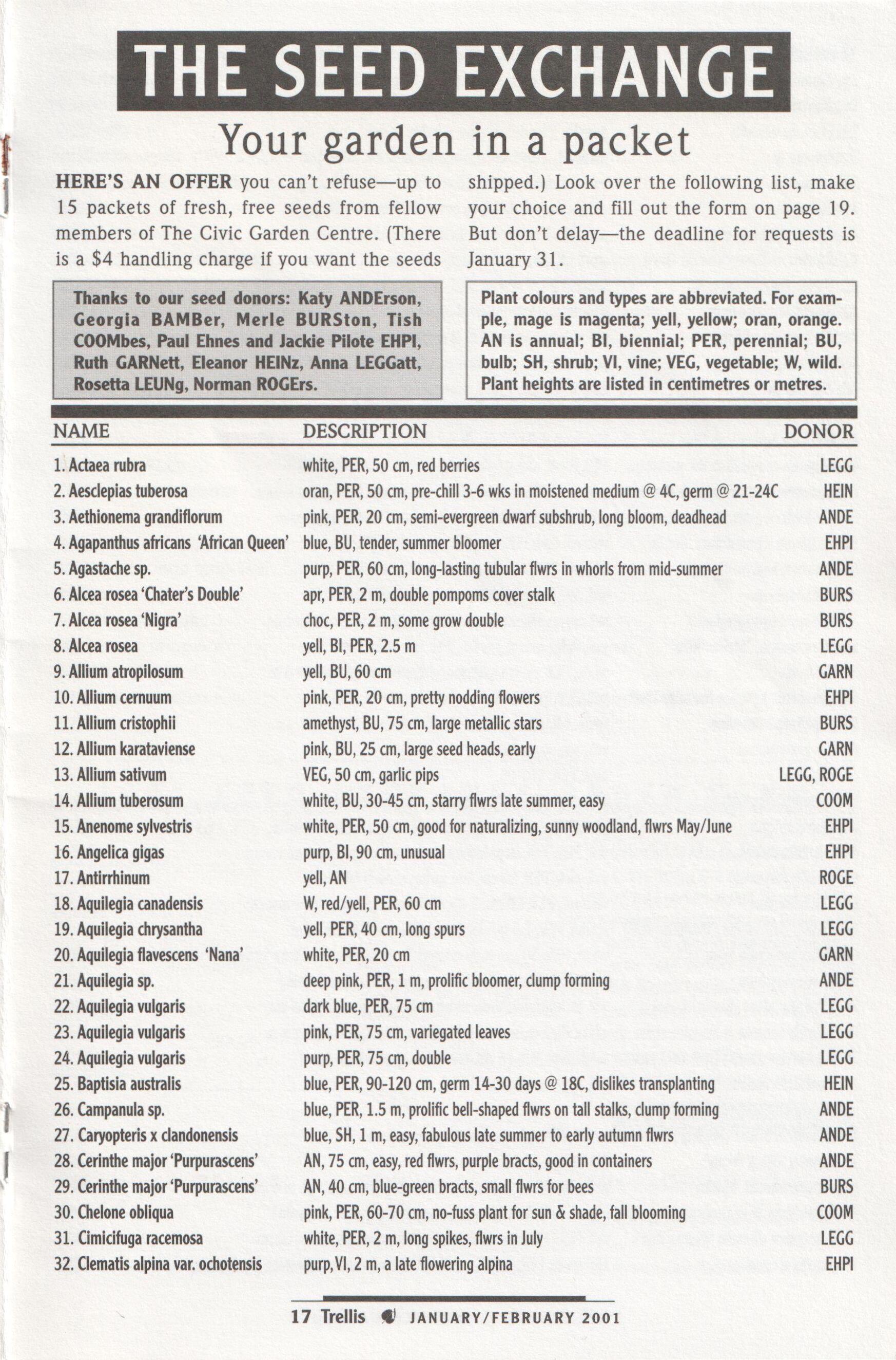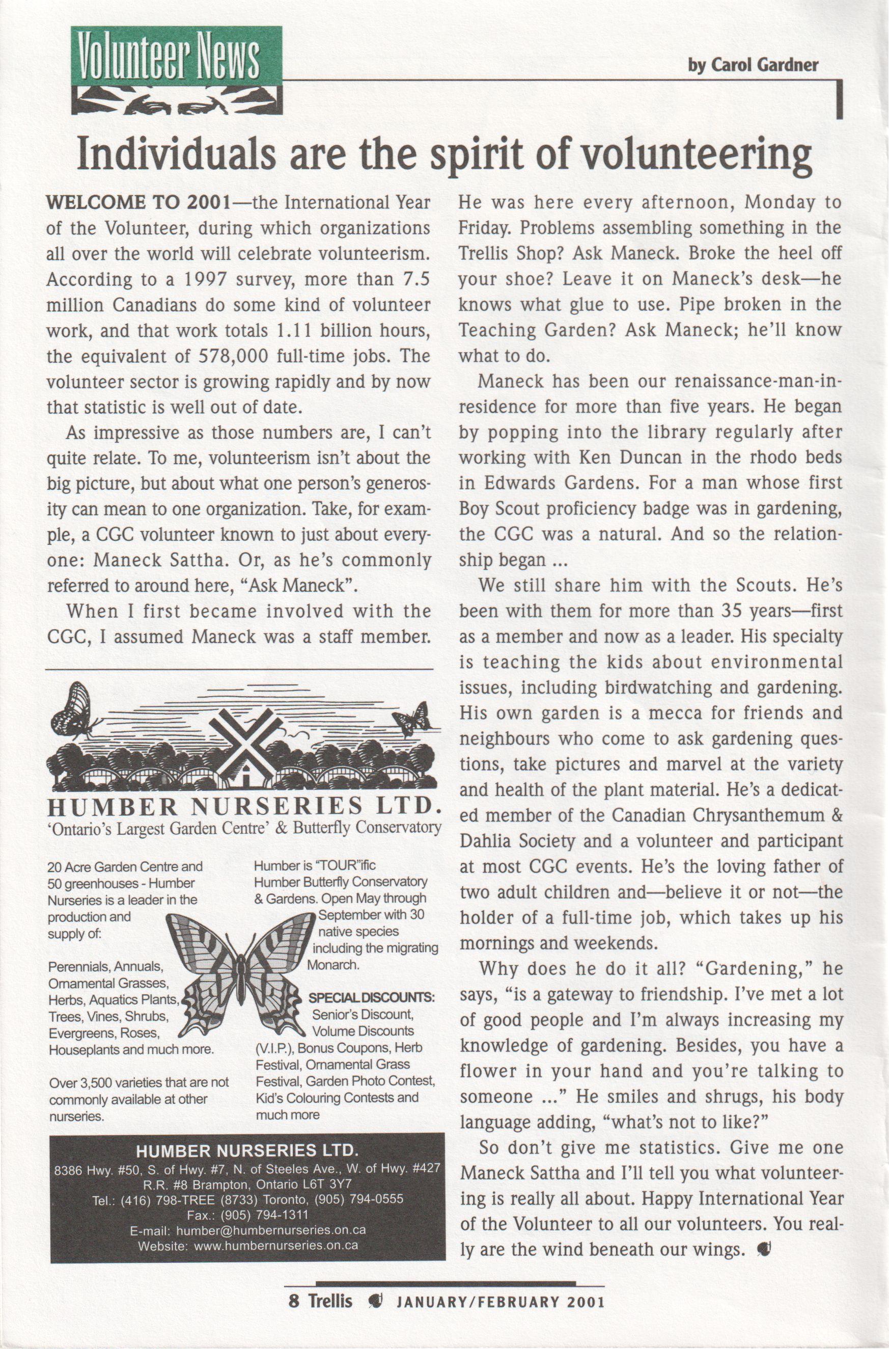 The Civic Garden Centre extends a hearty thankyou to the following individuals and companies for donating various in-kind services and products during 2000. This list does not include sponsors or those who made receipted donations.