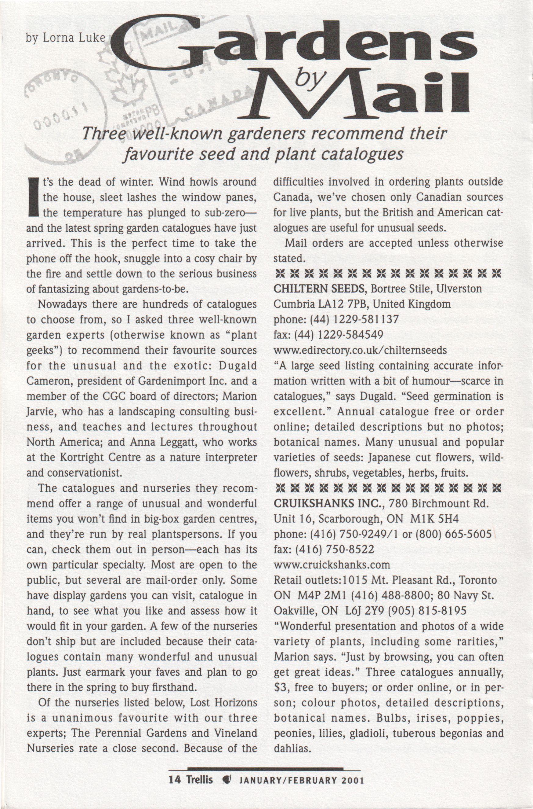 Join me on an exclusive tour visiting the most spectacular gardens in the south and southwest of England in May/June of 2001. Optional visit to Chelsea Flower Show. Group limited to 8 persons maximum. Fully escorted. Further information from Judy Prentice (905) 947-4595