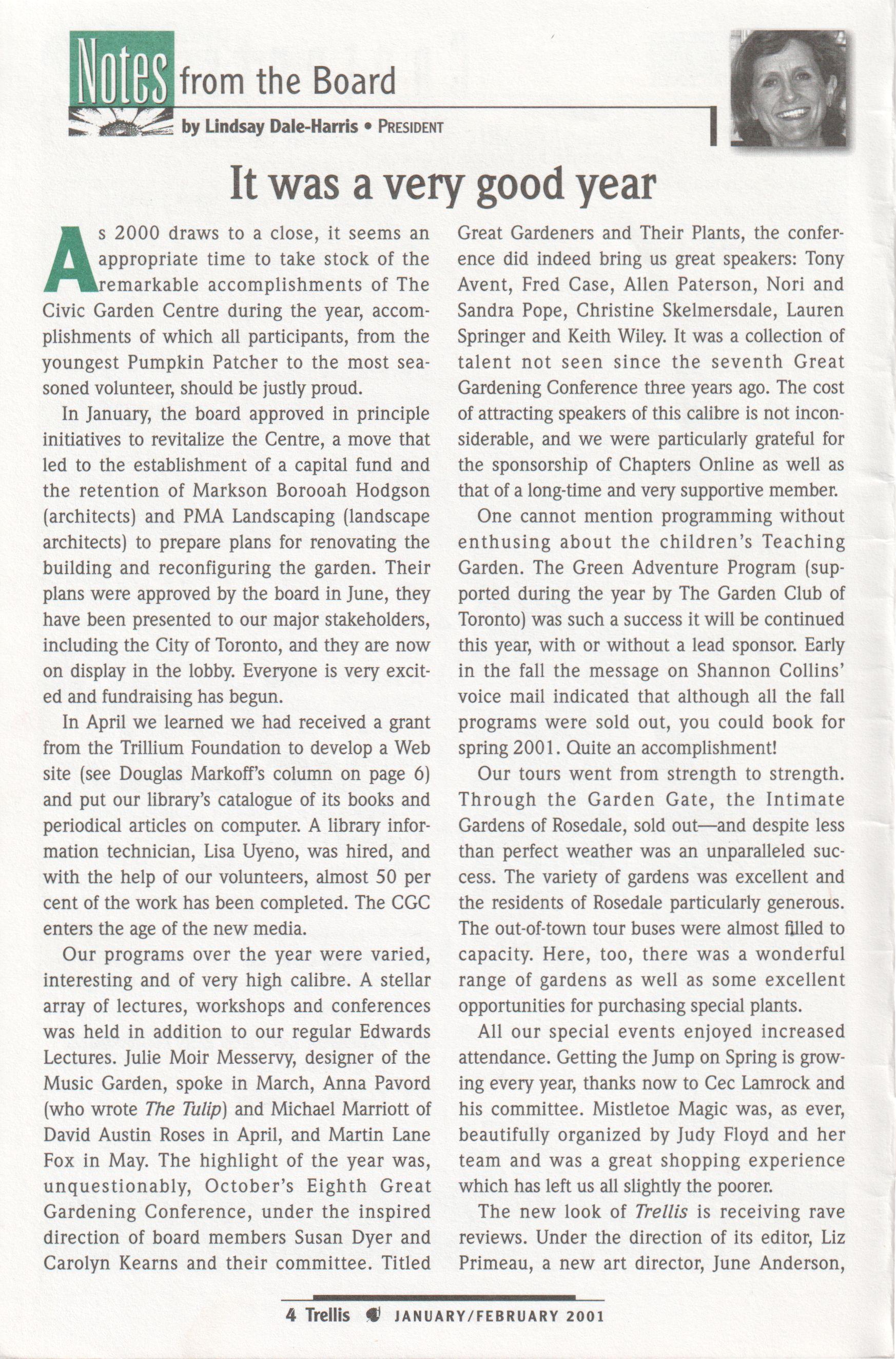 s 2000 draws to a close, it seems an Aappropriate time to take stock of the remarkable accomplishments of The Civic Garden Centre during the year, accomplishments of which all participants, from the youngest Pumpkin Patcher to the most seasoned volunteer, should be justly proud.