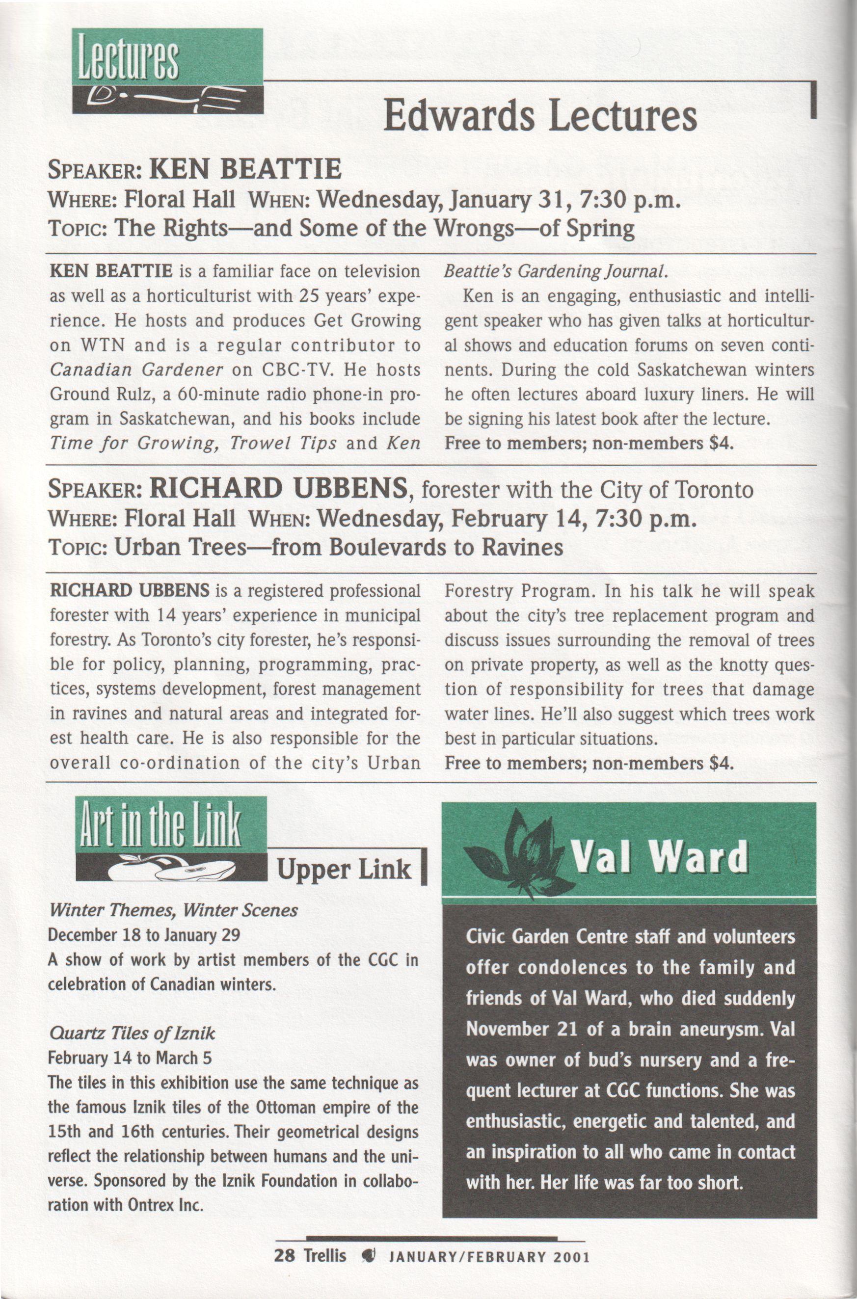 Civic Garden Centre staff and volunteers offer condolences to the family and friends of Val Ward, who died suddenly November 21 of a brain aneurysm. Val was owner of bud s nursery and a frequent lecturer at CGC functions. She was enthusiastic, energetic and talented, and an inspiration to all who came in contact with her. Her life was far too short.