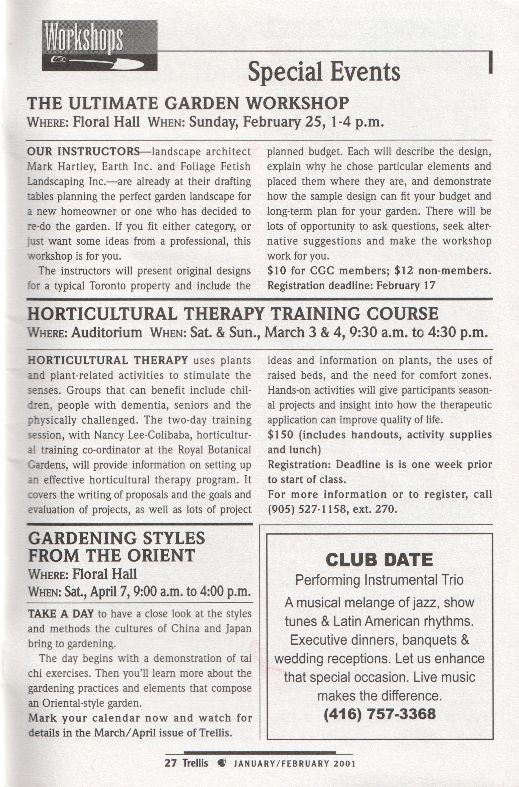 1958, is a voiunteerbased,not-for-pm torganizatmn whose nssion is to act as a central 8,000 books, 70 periodicals, and a large collection of clippings, pamphlets, nursery and seed catalogues, as well as a great selection of children s gardening books. Horticultural Information Servicesoffers free gardeninginformation year round, and the Trellis Shop has many unique gifts, books and gardening supplies for sale. The Teaching Garden has been created as a working garden to foster interest and educate people in the love and values of gardening and the natural world. As a communityservice, Art in the Link offers galleryspace to local artists. As well, the CGC has a wide variety of banquet halls, meeting rooms and show space, with access to Edwards Gardens, one ofToronto s favourite gardenspots.