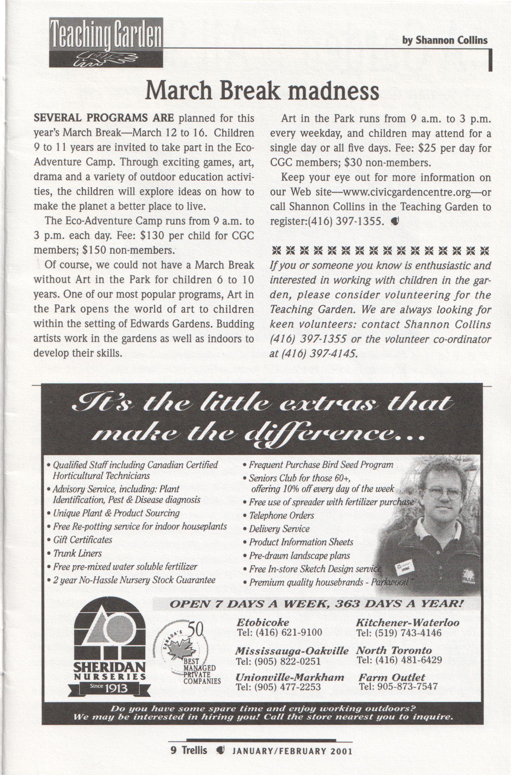 One cannot mention programming without enthusing about the children s Teaching Garden. The Green Adventure Program (supported during the year by The Garden Club of Toronto) was such a success it will be continued this year, with or without a lead sponsor. Early in the fall the message on Shannon Collins voice mail indicated that although all the fall programs were sold out, you could book for spring 2001. Quite an accomplishment!