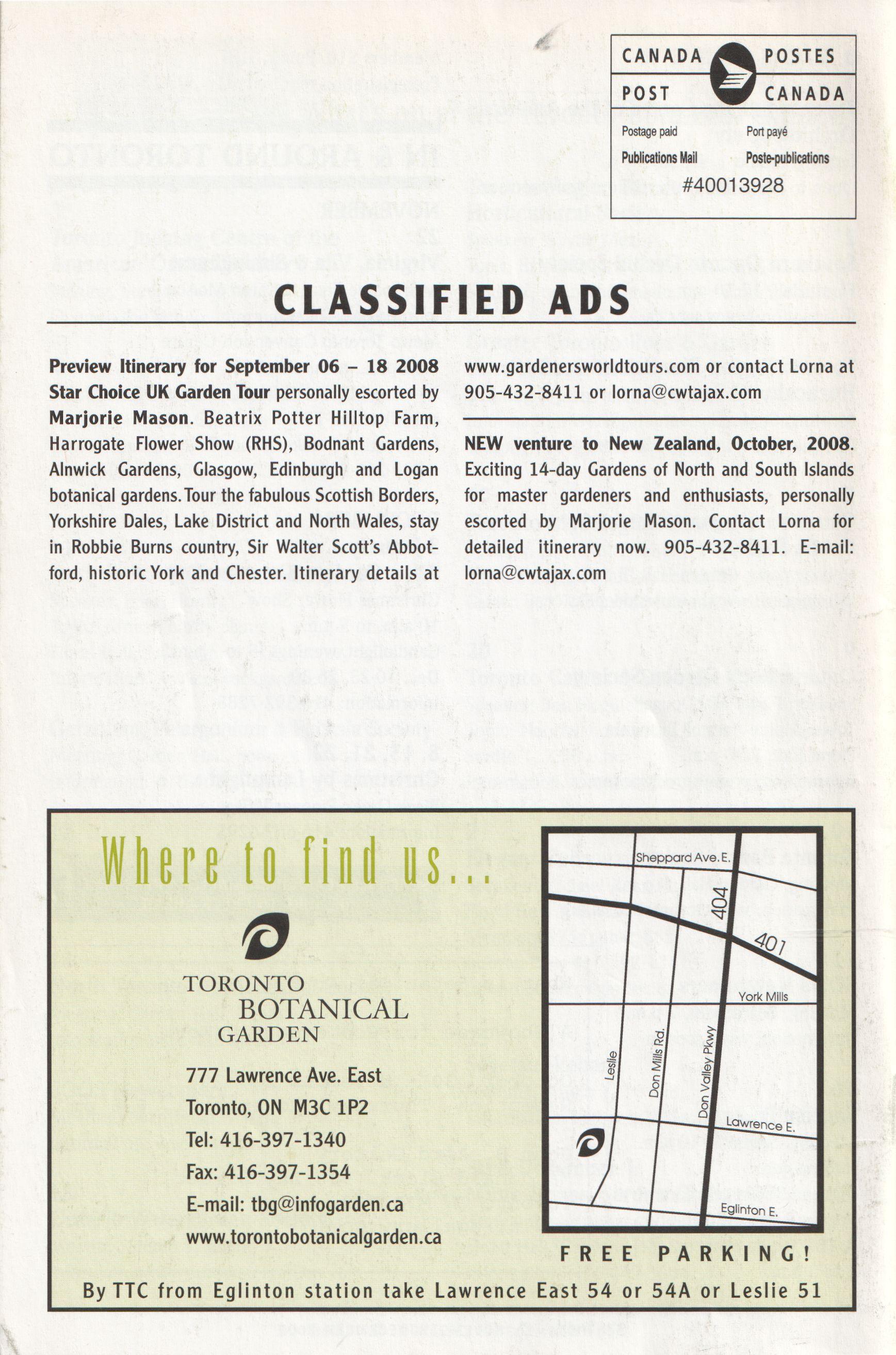 NEW venture to New Zealand, October, 2008. Exciting 14-day Gardens of North and South Islands for master gardeners and enthusiasts, personally escorted by Marjorie Mason. Contact Lorna for detailed itinerary now. 905-432-8411. E-mail: lorna@cwtajax.com