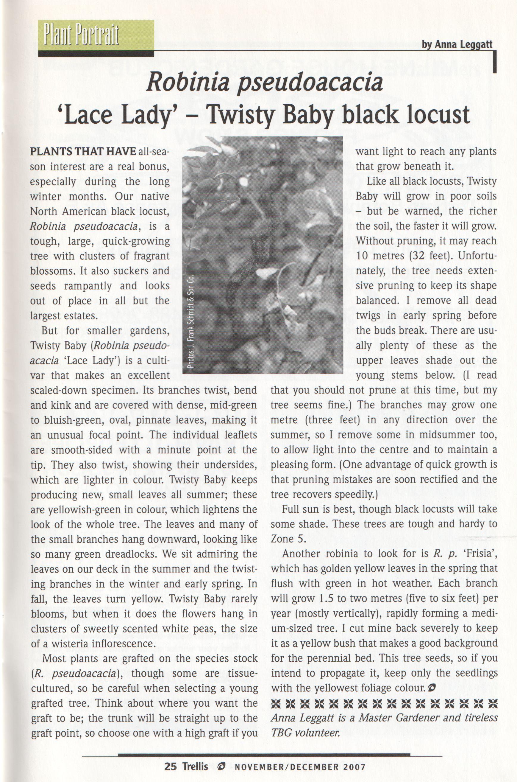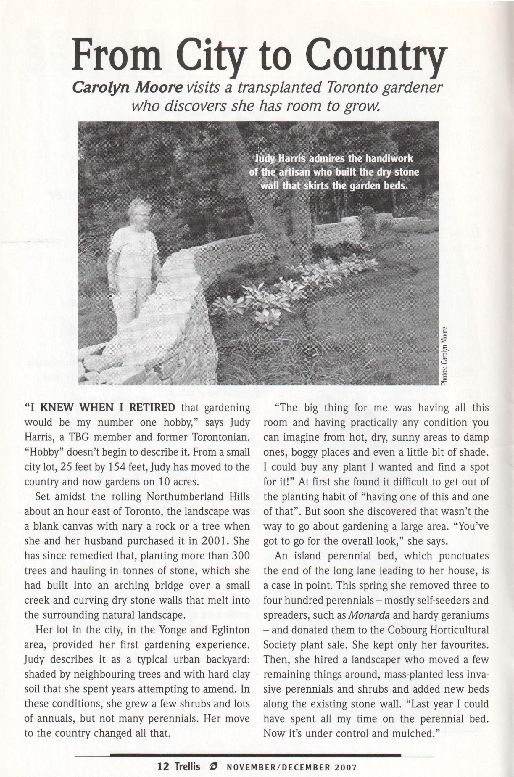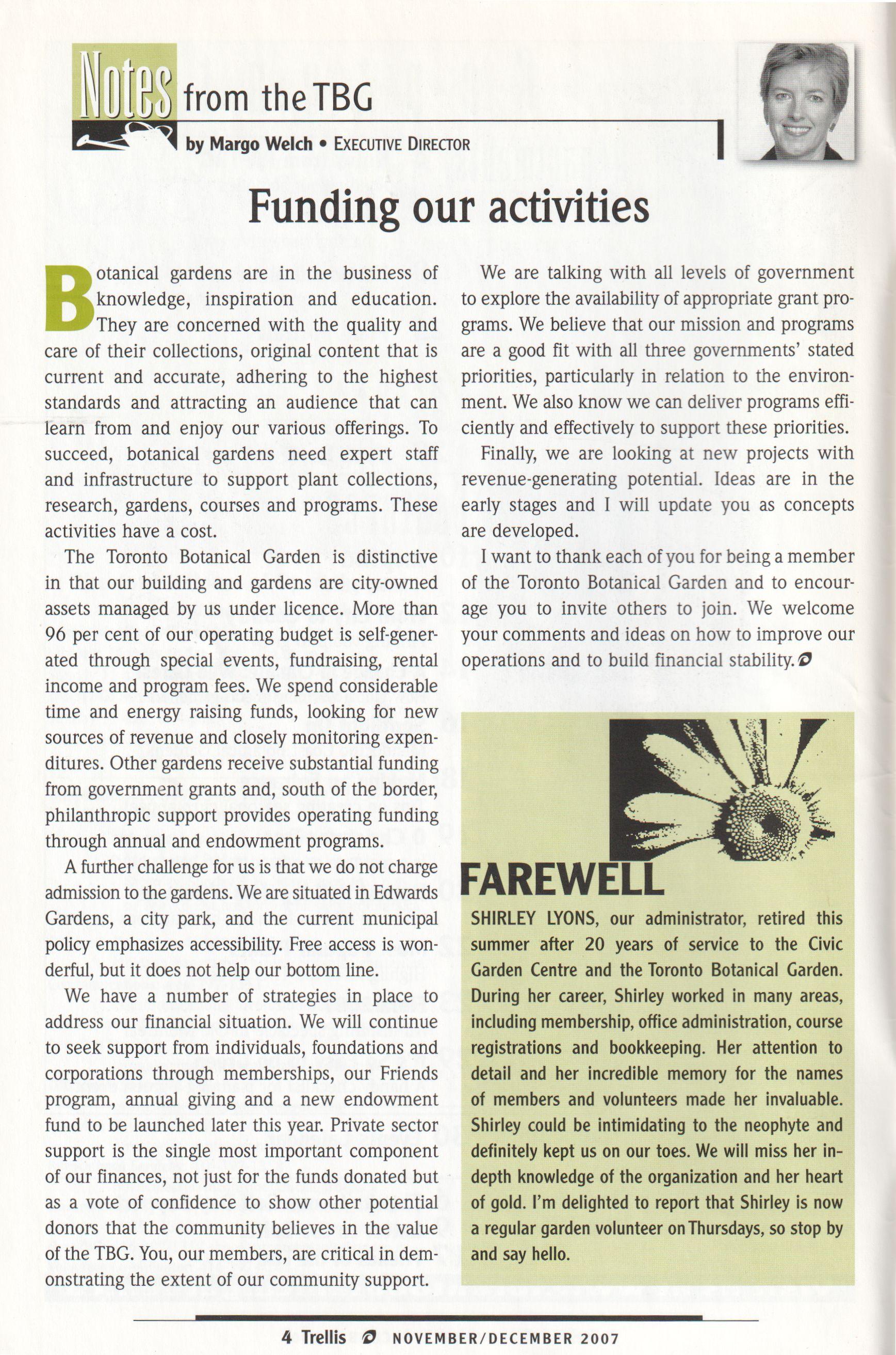 SHIRLEY LYONS, our administrator, retired this summer after 20 years of service to the Civic Garden Centre and the Toronto Botanical Garden. During her career, Shirley worked in many areas, including membership, office administration, course registrations and bookkeeping. Her attention to detail and her incredible memory for the names of members and volunteers made her invaluable. Shirley could be intimidating to the neophyte and definitely kept us on our toes. We will miss her indepth knowledge of the organization and her heart of gold. I 'm delighted to report that Shirley is now a regular garden volunteer onThursdays, so stop by and say hello.