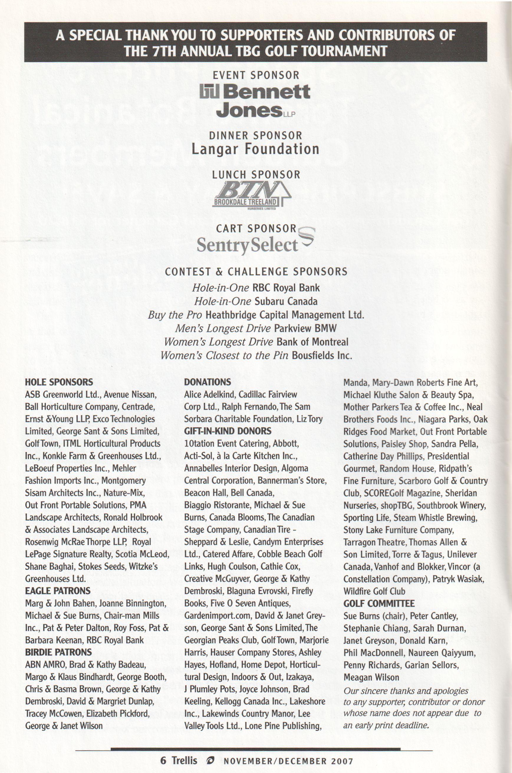 ASB Greenworld Ltd., Avenue Nissan, Ball Horticulture Company, Centrade, Ernst &Young LLP, ExcoTechnologies Limited, George Sant & Sons Limited, Golf Town, ITML Horticultural Products Inc., Konkle Farm & Greenhouses Ltd., LeBoeuf Properties Inc., Mehler Fashion Imports Inc., Montgomery Sisam Architects Inc., Nature-Mix, Out Front Portable Solutions, PMA Landscape Architects, Ronald Holbrook & Associates Landscape Architects, Rosenwig McRae Thorpe LLP, Royal LePage Signature Realty, Scotia McLeod, Shane Baghai, Stokes Seeds, Witzke s Greenhouses Ltd.