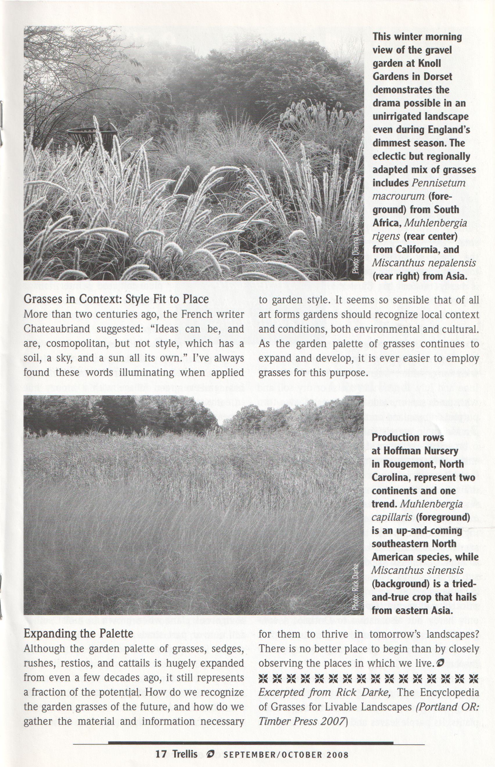 Rick Darke is a contextual design consultant, author, photographer and internationally recognized authority on the use of grasses and their relatives. Darke has written and illustrated many award-winning books including The Color Encyclopedia ofOrnamental Grasses. His latest and most comprehensive work, The Encyclopedia of Grasses for Livable Landscapes (see excerpt, page 16) includes over 1,000 photographs from around the world. Formerly Curator of Plants at Longwood Gardens, Rick Darke travels extensively in search of ideas to enrich North American gardens.