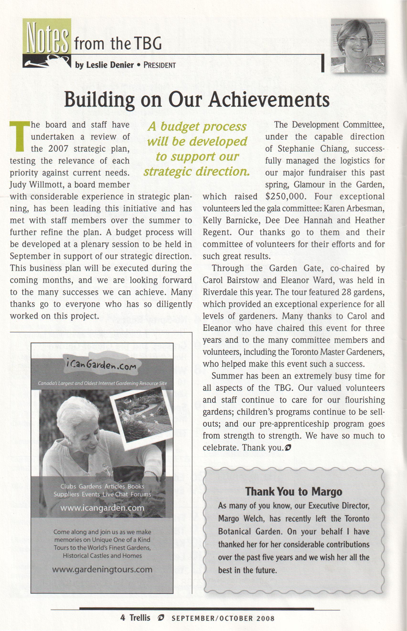 ~ As many of you know, our Executive Director, Margo Welch, has recently left the Toronto Botanical Garden. On your behalf | have ~ thankedherforherconsiderablecontributions - over the pastfiveyearsand wewish herall the best in the future.