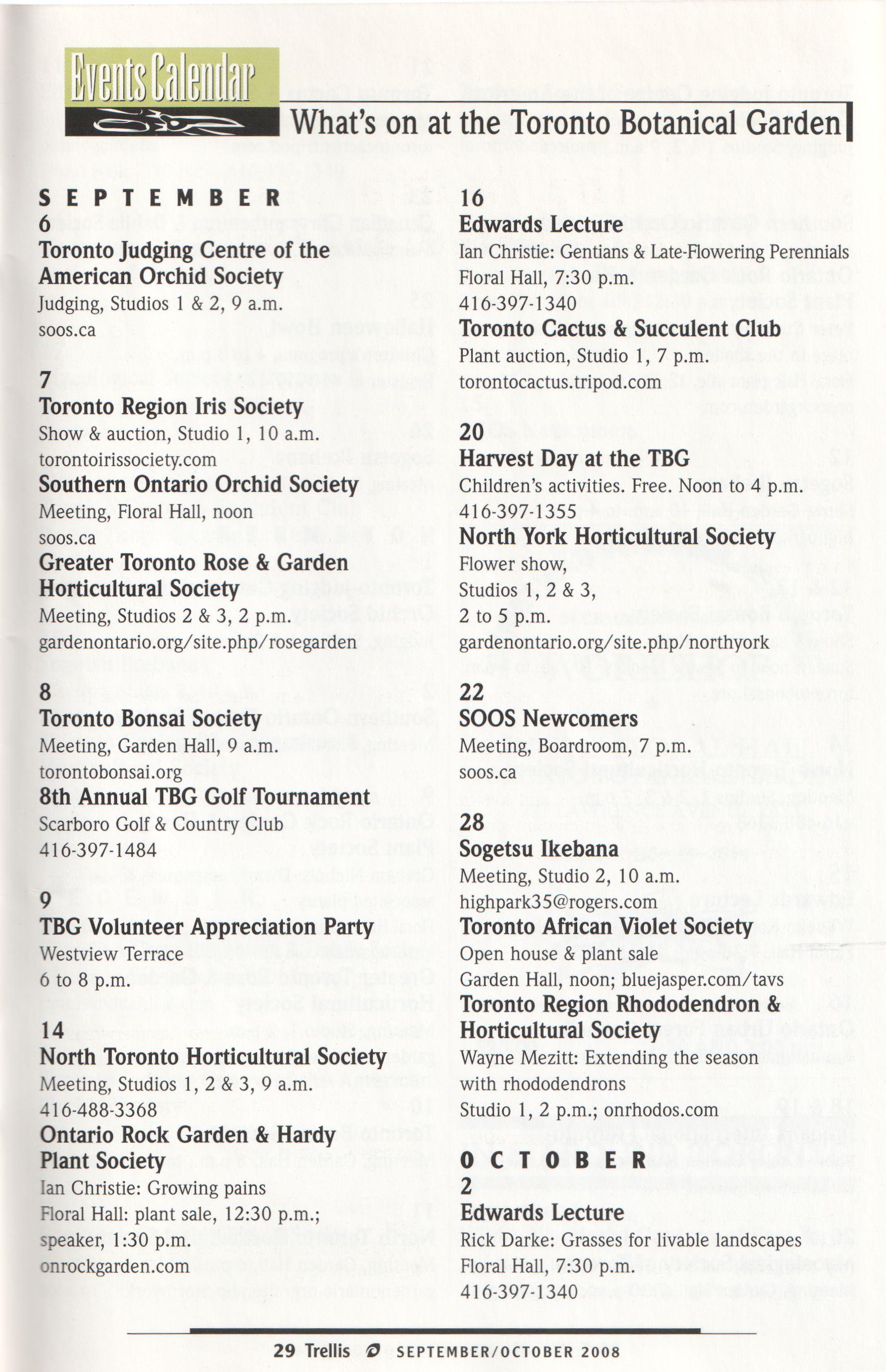 Open Gardens Toronto 2008 will have 23 private gardens open to the public on weekend afternoons in September and October. Each afternoon, visitors can see three or four gardens, grouped in an area of the city over a three hour period. Gardens are accessible byTTC, by walking and by car. Proceeds from the fees - $4 per garden or $25 for unlimited visits to all 23 gardens - go to the Canadian Women s Foundation. For more information visit our website at www.opengardenstoronto.com or pick up a brochure at your local garden centre or theToronto Botanical Garden.