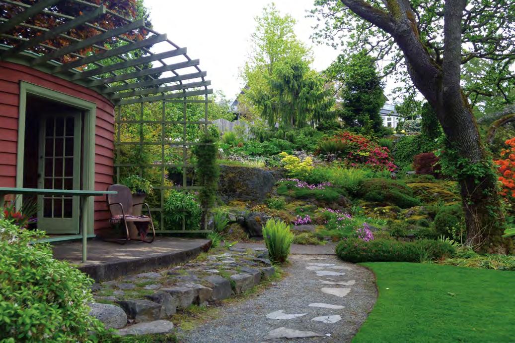 The story of their garden had actually begun before the Abkhazis were reunited. At this stage, the garden was more of an ugly duckling—a steeply sloped, oddly shaped property. Any ground not covered with weeds was dominated by exposed granite. But Peggy saw promise. At its top, the hilly site offered wonderful views, and some of the trees included mature Garry oaks (Quercus garryana), native to the area. She dove in, bought the property with some of the proceeds from the sale of her home in Shanghai and had it cleared.