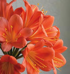 Dark green, smooth, strap-like 50- x 6-centimetre leaves fan out from the base of this herbaceous, evergreen plant. the flowers of Clivia miniata are like small amaryllis blooms—clusters of about ten, up-facing open bells on a smooth stout stalk. there are about six species, and more are being discovered. Some have small, tight, downward-facing bells, such as the hybrid i grow the flower colour is usually orange with a cream throat at the base, but many bloom in shades of orangey red, salmon, yellow, apricot, white, pink and even green. the foliage can be variegated with bright yellow or white stripes. these forest plants do not form bulbs but have fleshy roots that grow just below the surface. they like a slightly acidic, well-drained soil with a lot of humus. Water weekly when in active growth, fertilizing every other week with a slowrelease fertilizer. in the summer, keep