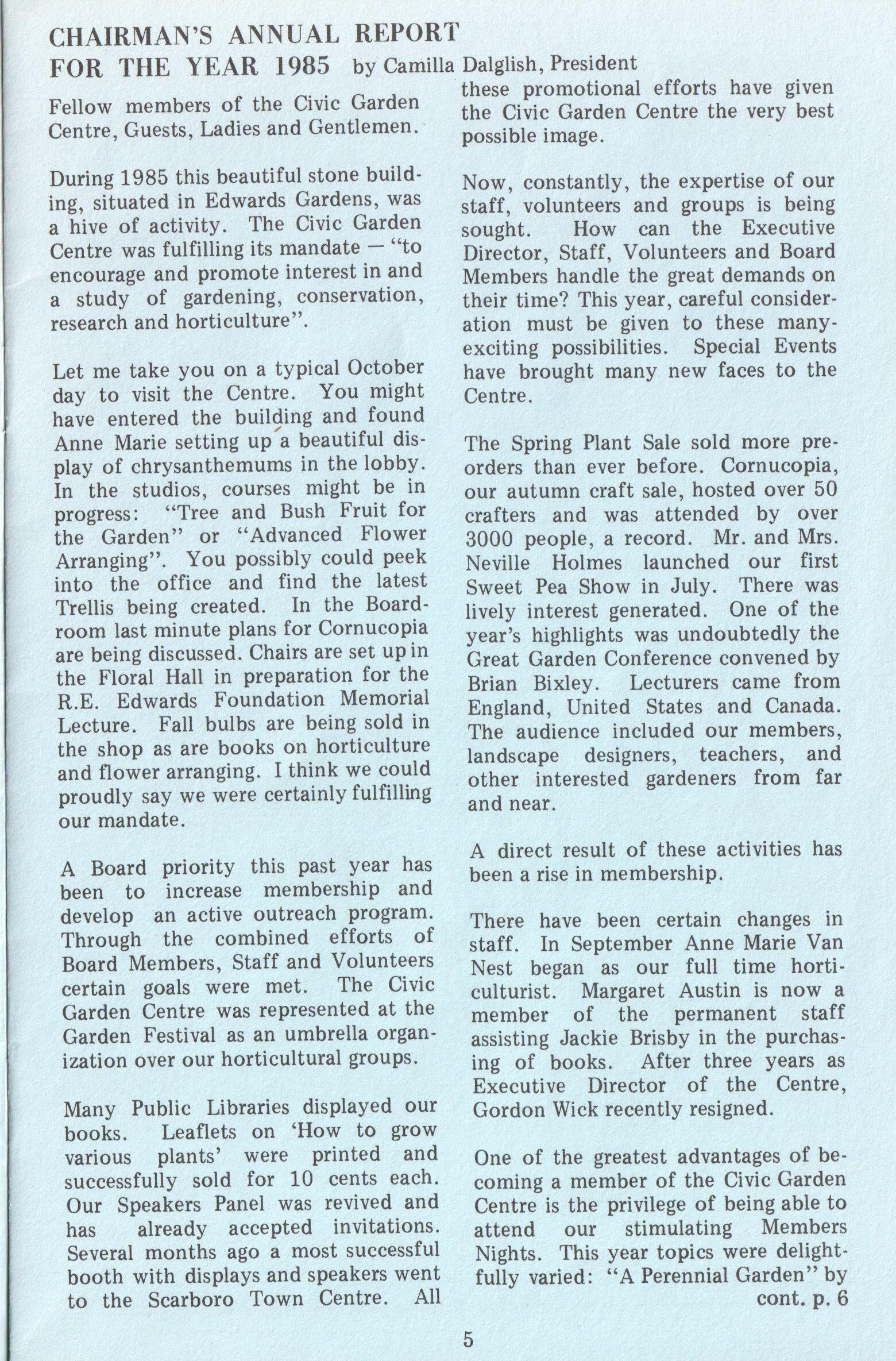 There have been certain changes in staff. In September Anne Marie Van Nest began as our full time horticulturist. Margaret Austin is now a member of the permanent staff assisting Jackie Brisby in the purchasing of books. After three years as Executive Director of the Centre, Gordon Wick recently resigned.