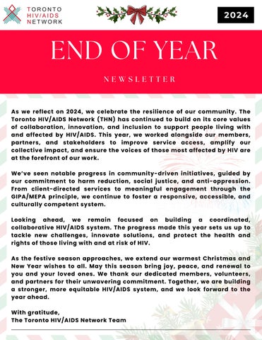 As we reflect on 2024, we celebrate the resilience of our community. The Toronto HIV/AIDS Network (THN) has continued to build on its core values of collaboration, innovation, and inclusion to support people living with and affected by HIV/AIDS. This year, we worked alongside our members, partners, and stakeholders to improve service access, amplify our collective impact, and ensure the voices of those most affected by HIV are at the forefront of our work. We’ve seen notable progress in community-driven initiatives, guided by our commitment to harm reduction, social justice, and anti-oppression. From client-directed services to meaningful engagement through the GIPA/MEPA principle, we continue to foster a responsive, accessible, and culturally competent system. Looking ahead, we remain focused on building a coordinated, collaborative HIV/AIDS system. The progress made this year sets us up to tackle new challenges, innovate solutions, and protect the health and rights of those living with and at risk of HIV. As the festive season approaches, we extend our warmest Christmas and New Year wishes to all. May this season bring joy, peace, and renewal to you and your loved ones. We thank our dedicated members, volunteers, and partners for their unwavering commitment. Together, we are building a stronger, more equitable HIV/AIDS system, and we look forward to the year ahead. With gratitude, The Toronto HIV/AIDS Network Team
