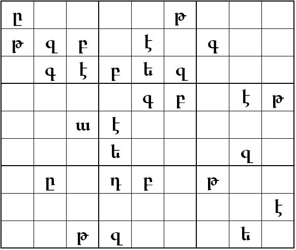 1 ճ/դ աղ • սեւ եւ կարմիր պղպեղ՝ ըստ ճաշակի • 3 կանաչ սոխ՝ մանրուած, զարդարելու համար • կէս փունջ ազատքեղ՝ մանրուած, զարդարելու համար Ձաւարով աղցան (6-էն 8 հոգիի համար) Զուլալին առանձնատառը (հայերէն sudoku) Պատրաստութեան եղանակը Կաթսայի մը մէջ սոխը ձէթին մէջ եփել միջին ջերմաստիճանի վրայ, մինչեւ կիսաթափանցիկ դառնայ։ Աւելցնել լոլիկը եւ երբ ան լաւ տաքնայ աւելցնել լոլիկի եւ պղպեղի մածուկը, համեմունքները եւ շարունակել խառնել։ Համտեսել եւ կարգաւորել համեմունքներուն չափը՝ ըստ նախասիրութեան: Լոլիկը եփել այնքան, մինչեւ ամբողջովին փափկի եւ մեծաւ մասամբ հալի, կաթսան հանել կրակէն եւ ձգել խառնուրդը պաղի: Պաղելէն ետք, խառնել ձաւարին մէջ եւ ձգել քսան վայրկեան: Աւելցնել մէկ կիտրոնի հիւթ եւ լաւ խառնել։ Պատրաստ ըլլալէն ետք աղցանը տարածել մատուցուող մեծ ամանի մը մէջ եւ զարդարել կանաչ սոխով եւ ազատքեղով: Կարելի է զայն վայելել հազարի տերեւներով կամ խաղողի թարմ տերեւներով։ լուսանկարը՝ Սիրուն Բարսեղեանի