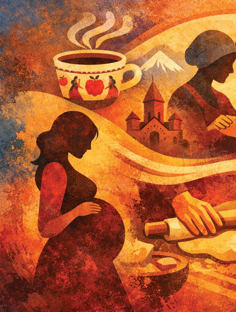 We sat around the table with our heads bowed, my hands resting on the curve of my rounded belly. The unnerving silence was broken only by the sharp slurps of coffee. Our cups were small, each painted with bright red pomegranates and women in traditional dress dancing in circles--hand-painted by elderly women from a small village near Yerevan. Every detail carried history. Every sip carried weight.