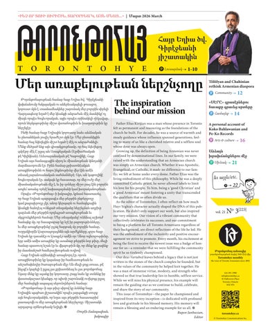 This issue of Torontohye—the paper he championed and inspired from its very inception—is dedicated with profound love and gratitude to his blessed memory. His memory will remain a blessing and an enduring example for us all. ֎ Rupen Janbazian, Editor