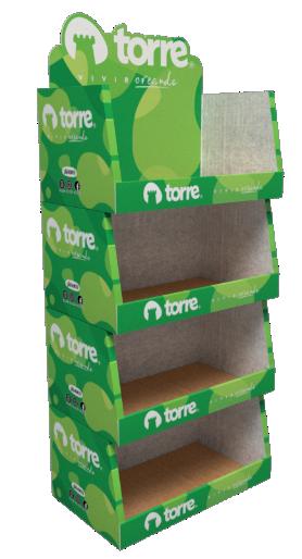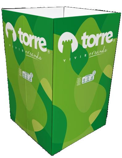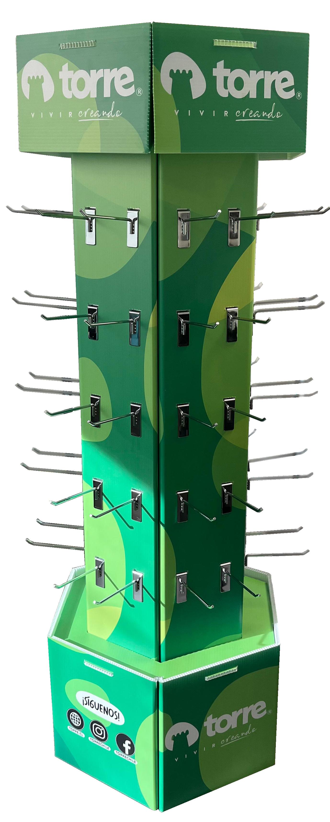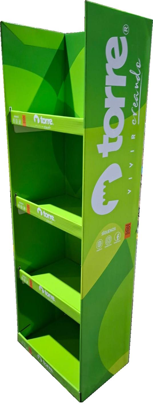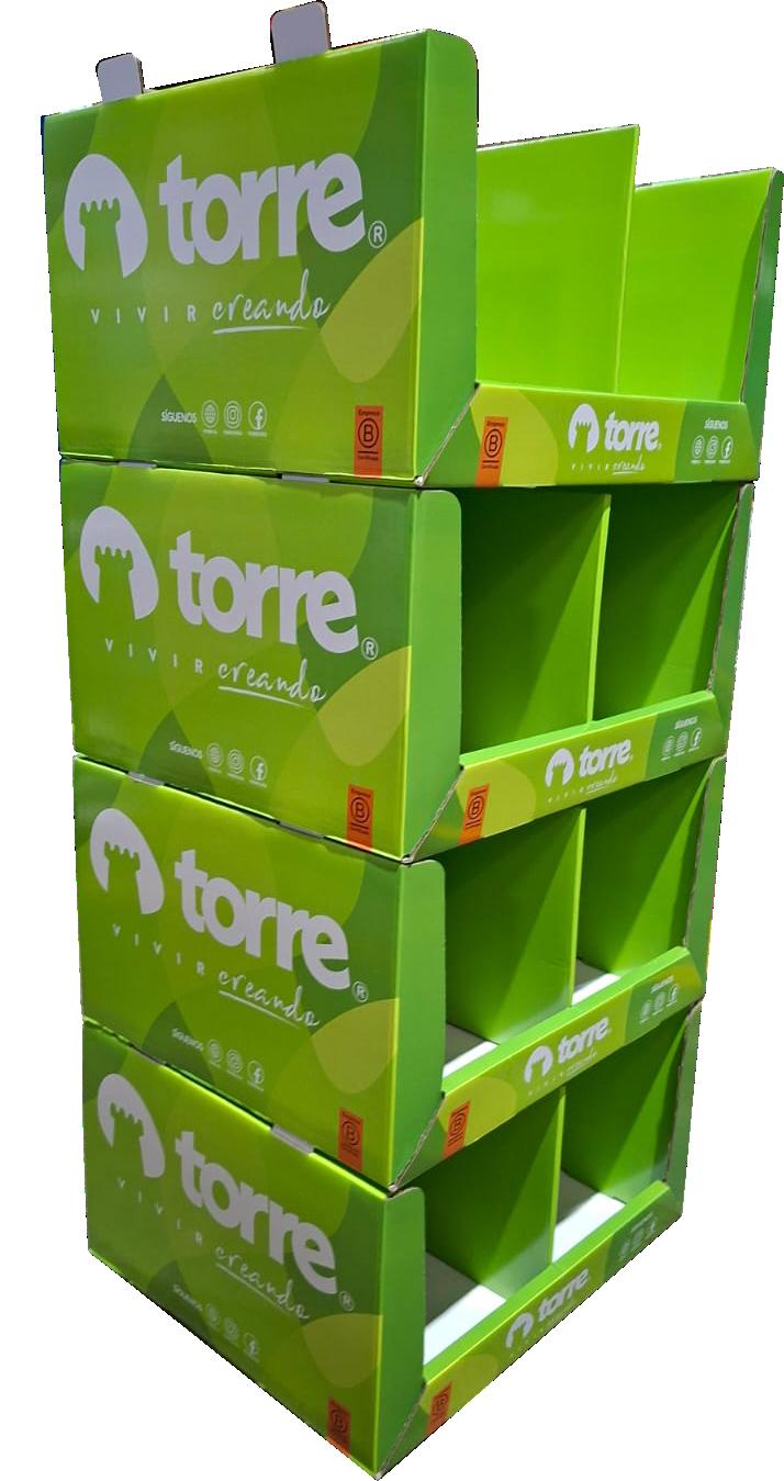 Exhibidor en cartón tipo apilable de 5 niveles, liviano y de alta resistencia de carga ideal para escolar.