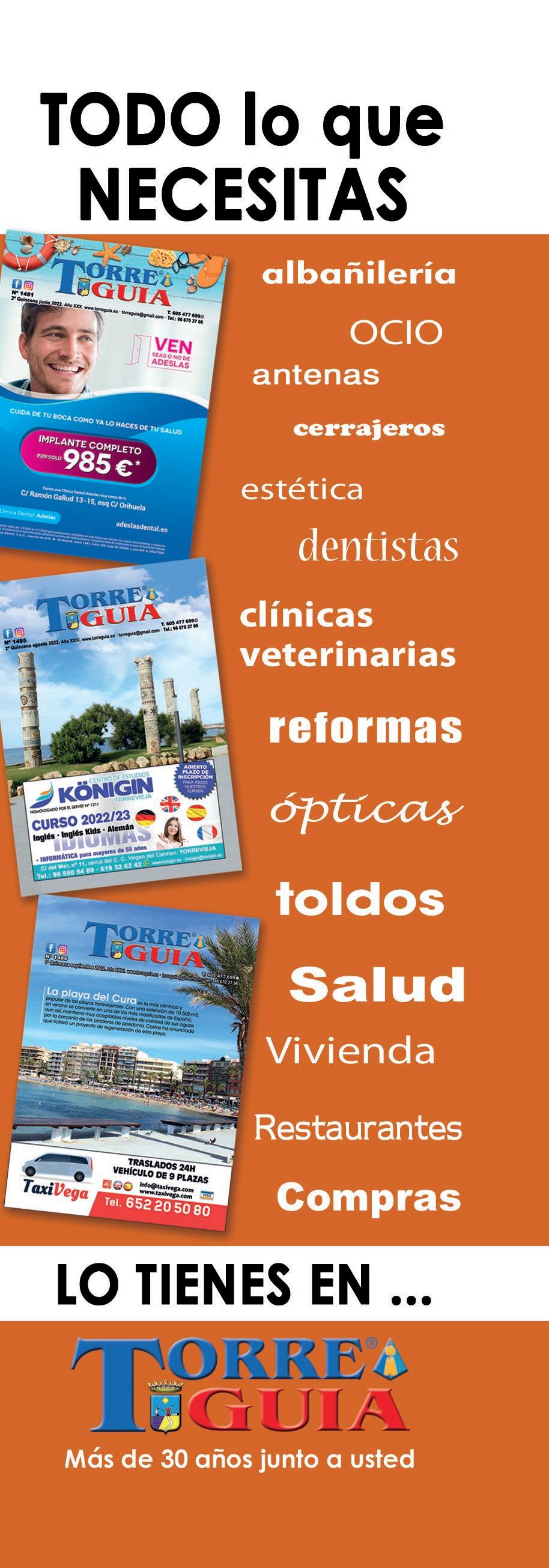 E-mail: torreguia@gmail.com www.torreguia.es Oficinas: C/ Orihuela, 34 bajo. Torrevieja Directora: María José Jiménez. Diseño Gráfico: Aurora Birlanga Ana Llopis Redacción: Noemí Campillo Atención al cliente: Desirée Quesada Joaquín Sáez Depósito Legal: M - 35587 - 1992