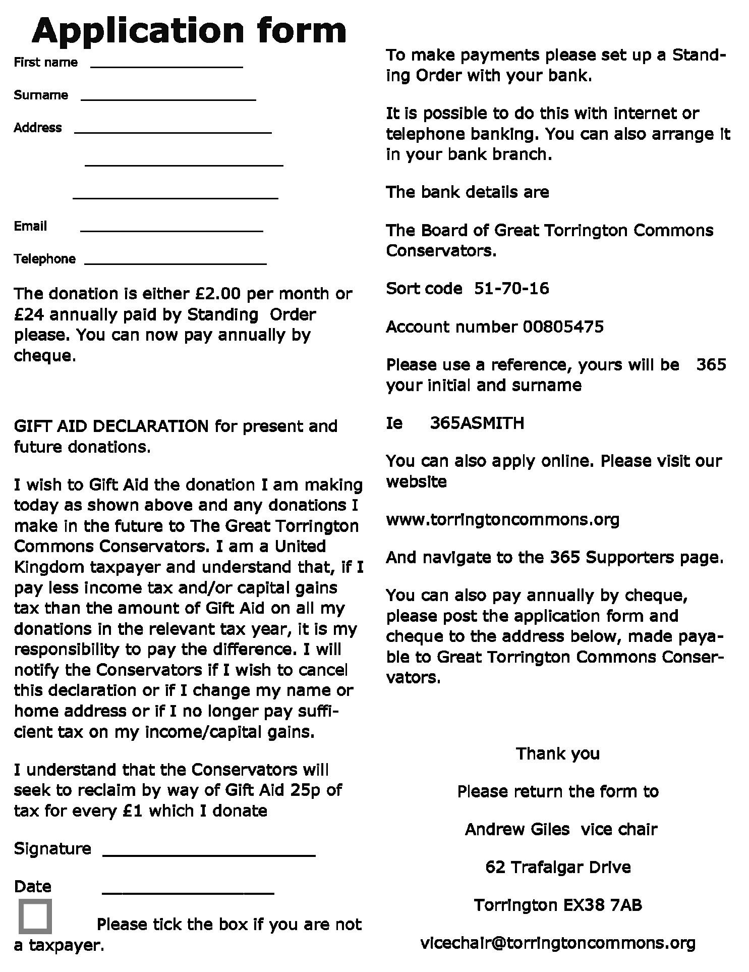 Option 2 visit www.torringtoncommons. org and navigate to the 365 Supporters page where you can apply online. Here you have the option of paying by PayPal or standing order annually or monthly.
