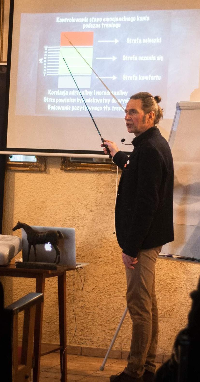 utrudniać sobie i naszym koniom to zadanie. Także charakterystyczna budowa i uwarunkowania genetyczne nastawione na wyścigowe użytkowanie folblutów stanowią wyzwanie przy zmianie dyscypliny. Wyścigowy galop, to nie galop skoczka czy ujeżdżeniowca, ale praca nad nowym wzorcem ruchowym z powodzeniem pozwala tym koniom rywalizować w tych konkurencjach. Może niekoniecznie o medale, ale w etycznym jeździectwie nie to jest wyznacznikiem sukcesu, a empatyczna relacja i harmonia między naszymi gatunkami. Uwzględnienie ich delikatnych grzbietów, budowy kończyn i sposobu poruszania się wynikającego z błyskawicznych napięć mięśniowych i gotowości do działania to jedno. Kolejne to wzięcie pod uwagę wymagań socjalno-bytowych i behawioralnych, a przede wszystkim subtelnego i szybkiego przekazywania informacji niewerbalnych. Nauka tego końskiego języka, a w szczególności „angielskiego” dialektu pozwala na stworzenie wyjątkowej więzi z tą inteligentną i bystrą rasą. I to o niej najczęściej opowiadali uczestnicy wykładu. Z ich doświadczeń wynika, że problemy pojawiają się zazwyczaj, kiedy stawiane koniom zadania wymagają poruszania się na