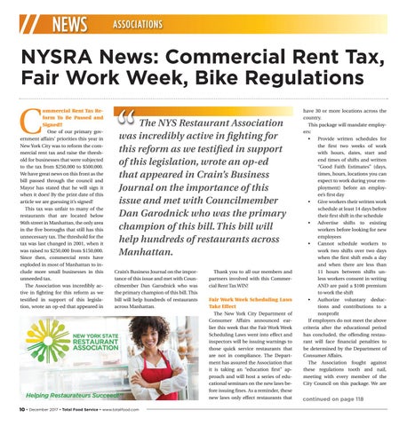 ommercial Rent Tax Reform To Be Passed and Signed!! One of our primary government affairs’ priorities this year in New York City was to reform the commercial rent tax and raise the threshold for businesses that were subjected to the tax from $250,000 to $500,000. We have great news on this front as the bill passed through the council and Mayor has stated that he will sign it when it does! By the print date of this article we are guessing it’s signed! This tax was unfair to many of the restaurants that are located below 96th street in Manhattan, the only area in the five boroughs that still has this unnecessary tax. The threshold for the tax was last changed in 2001, when it was raised to $250,000 from $150,000. Since then, commercial rents have exploded in most of Manhattan to include more small businesses in this unneeded tax. The Association was incredibly active in fighting for this reform as we testified in support of this legislation, wrote an op-ed that appeared in