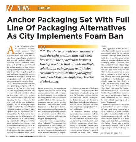 We aim to provide our customers with the right product, that will work best within their particular business. Having products that provide multiple solutions in a single unit really helps customers minimize their packaging costs,” said Marilyn Stapleton, Director of Marketing. keting perspective, foam packaging appears inexpensive, which many consumers associate with low quality. Implementing better packaging instantly presents the food as better quality, which is the message that operators want to convey to their customers,” explained Mike Thaler, Executive Vice President. Restaurant operators should consider the fact that quality packaging presents as a premium product, which leads customers to return and may even support higher pricing. Customer service is crucial at Anchor Packaging. The company has implemented a multifaceted customer outreach strategy, which in turn provides great industry insight. First, there are a number of employ-