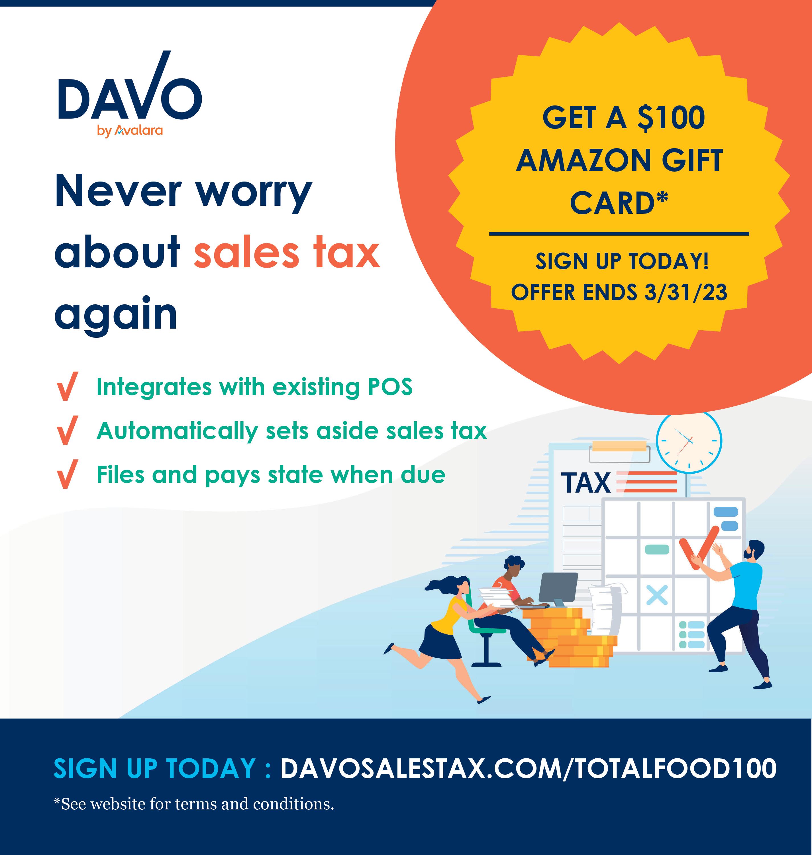 DAVO Sales Tax can help you gain back valuable time to focus on the priorities that will help the business grow. With just a few minutes of set up, your sales tax process, filing and payments are on autopilot. Give it a try and see how much time and hassle you can save. We know how hard tax season can be so we’re offering an incentive this month!