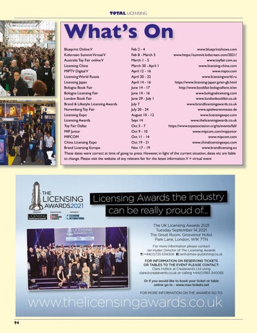 Blueprint Online V Feb 2 - 4 www.blueprintshows.com Kidscreen Summit Virtual V Feb 8 - March 5 www.https://summit.kidscreen.com/2021/ Australia Toy Fair online V March 1 - 5 www.toyfair.com.au Licensing China March 30 - April 1 www.licensing-china.com MIPTV Digital V April 12 - 16 www.miptv.com Licensing World Russia April 20 - 22 www.licensingworld.ru Licensing Japan April 14 - 16 https://www.licensing-japan.jp/en-gb.html Bologna Book Fair June 14 - 17 http://www.bookfair.bolognafiere.it/en Bologna Licensing Fair June 14 - 16 www.bolognalicensing.com London Book Fair June 29 - July 1 www.londonbookfair.co.uk Brand & Lifestyle Licensing Awards July 7 www.brandlicensingawards.co.uk Nuremberg Toy Fair July 20 - 24 www.spielwarenmesse.de Licensing Expo August 10 - 12 www.licensingexpo.com Licensing Awards Sept 14 www.thelicensingawards.co.uk Toy Fair Dallas Oct 5 - 7 https://www.toyassociation.org/ta/events/fall/ MIP Junior Oct 9 - 10 www.mipcom.com/mipjunior MIPCOM Oct 11 - 14 www.mipcom.com China Licensing Expo Oct 19 - 21 www.chinalicensingexpo.com Brand Licensing Europe Nov 17 - 19 www.brandlicensing.eu These dates were correct at time of going to press. However, in light of the current situation, dates etc are liable to change. Please visit the website of any relevant fair for the latest information.V = virtual event