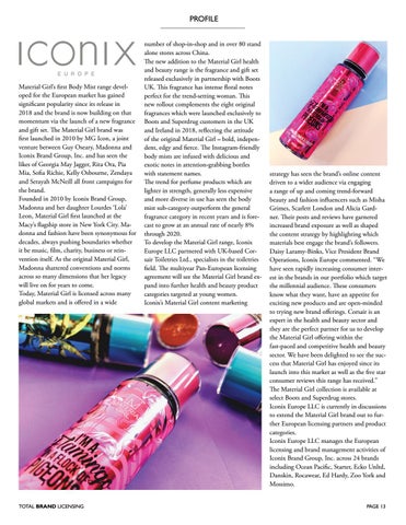 strategy has seen the brand’s online content driven to a wider audience via engaging a range of up and coming trend-forward beauty and fashion influencers such as Misha Grimes, Scarlett London and Alicia Gardner. Their posts and reviews have garnered increased brand exposure as well as shaped the content strategy by highlighting which materials best engage the brand’s followers. Daisy Laramy-Binks, Vice President Brand Operations, Iconix Europe commented. “We have seen rapidly increasing consumer interest in the brands in our portfolio which target the millennial audience. These consumers know what they want, have an appetite for exciting new products and are open-minded to trying new brand offerings. Corsair is an expert in the health and beauty sector and they are the perfect partner for us to develop the Material Girl offering within the fast-paced and competitive health and beauty sector. We have been delighted to see the success that Material Girl has enjoyed since its launch into this market as well as the five star consumer reviews this range has received.” The Material Girl collection is available at select Boots and Superdrug stores. Iconix Europe LLC is currently in discussions to extend the Material Girl brand out to further European licensing partners and product categories. Iconix Europe LLC manages the European licensing and brand management activities of Iconix Brand Group, Inc. across 24 brands including Ocean Pacific, Starter, Ecko Unltd, Danskin, Rocawear, Ed Hardy, Zoo York and Mossimo. PAGE 13