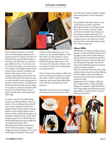 DTR AND LICENSING the retailers get a continual supply of unique, aspirational products to sell at competitive margins. The possibilities and opportunities to create and develop private labels using DTR licensing partnerships are seemingly endless. This is set to continue, as long as retailers and licensors remember that consumers are becoming increasingly sophisticated. The winners will be those who provide them with a product that not only delivers on cost but also gives them a memorable experience that leaves them wanting more.