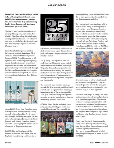 all over the world as well as being featured on countless licensed products. They are extremely proud to provide the same great service and satisfaction to their smaller customers as they do to their larger ones. The future looks bright at Penny Lane! They are intent on staying relevant and productive in an ever-changing industry. They aim to continue building those relationships with customers and artists that have been so important to the success of their business. The last 25 years have been good to Penny Lane, but everyone at the company is eager for the world to see what they have in store for the next 25 years! Penny Lane Fine Art & Licensing can be found online at www.pennylanepublishing. com. You can follow them on Instagram and Facebook @pennylanepublishing. They can be contacted by email at info@ pennylanepublishing.com or phone at (937) 849-1101.