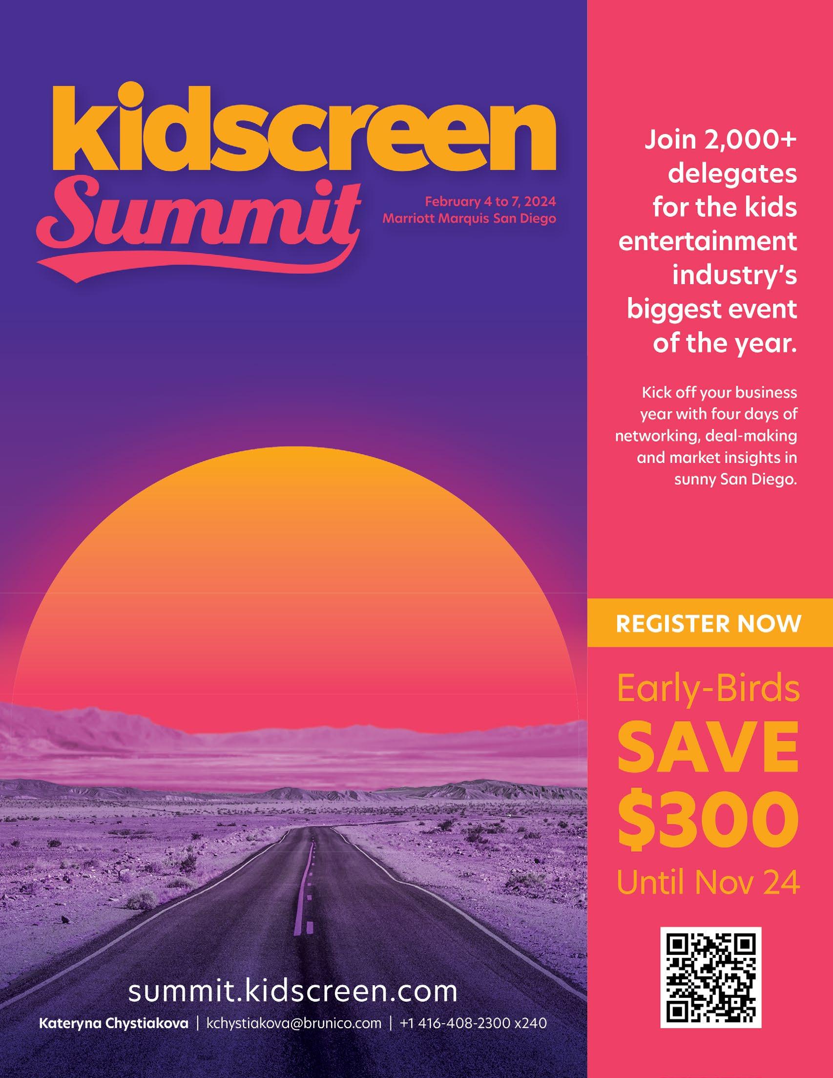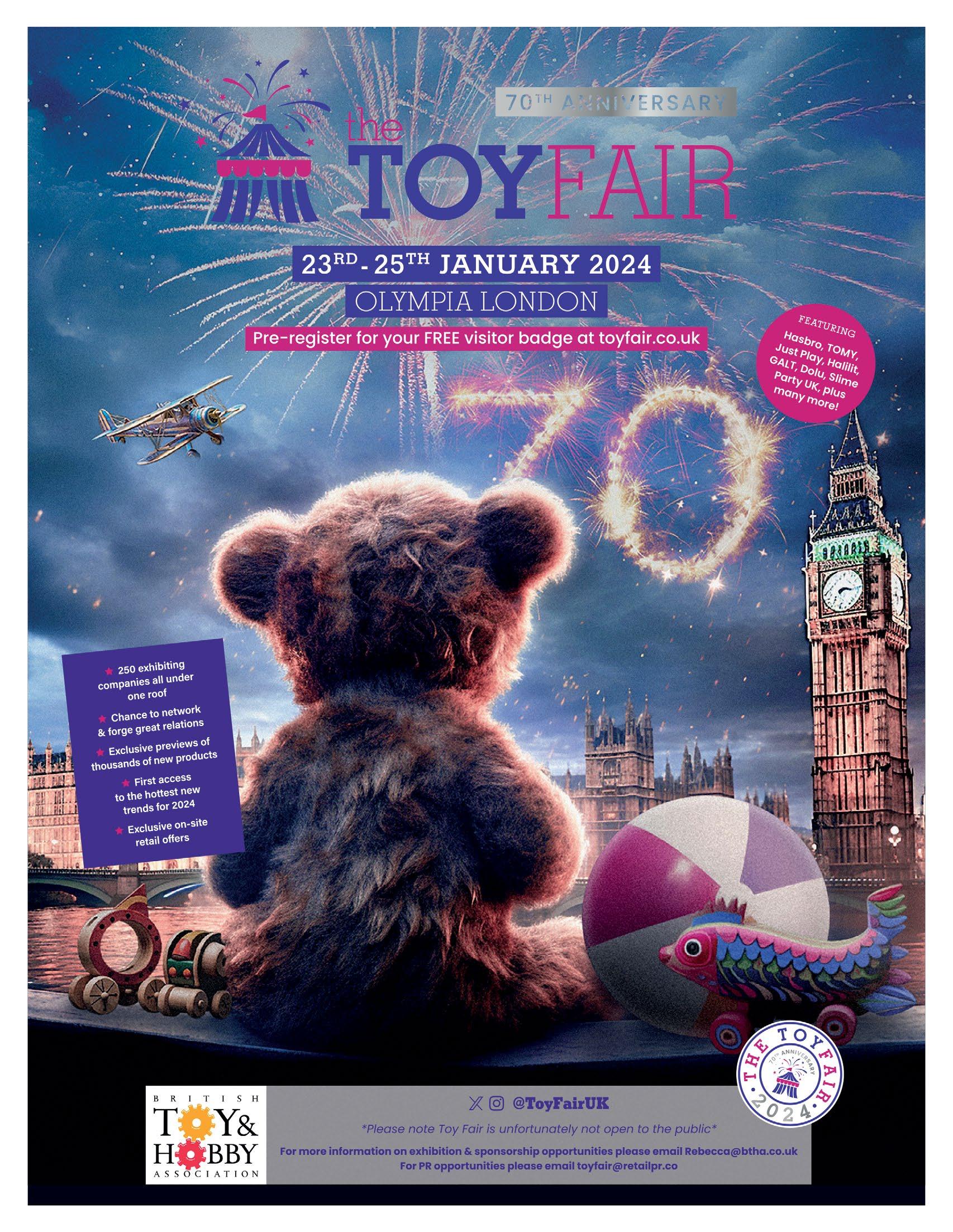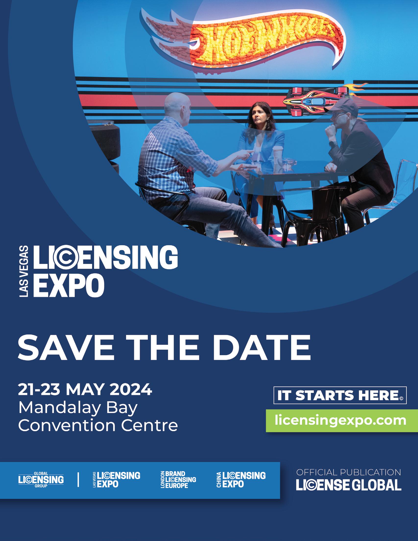 TOTAL LICENSING 174 New York Toy Fair Sep 30 - Oct 3 www.toyfairny.com Brand Licensing Europe Oct 4 - 6 www.brandlicensing.eu MIP Junior Oct 14 - 15 www.mipjunior.com MIPCOM Oct 16 - 19 www.mipcom.com China Licensing Expo Oct 17 - 19 www.chinalicensingexpo.com Frankfurt Book Fair Oct 18 - 22 www.buchmesse.de/en India Licensing Expo 2023 Nov 19 - 20 www.licenseindia.com Cartoons on the Bay Nov 29 - Dec 1 www.cartoonsbay.rai.it/en/ CES Jan 9 - 12 2024 www.ces.tech Atlanta Gift Market Jan 16 - 22 www.americasmart.com British Toy & Hobby Fair Jan 23 - 25 www.toyfair.co.uk Paperworld Jan 26 - 30 www.paperworld.messefrankfurt.com Nuremberg Toy Fair Jan 30 Jan - Feb 3 www.spielwarenmesse.de/toys/trade-fair Kidscreen Summmit Feb 4 - 7 www.summit.kidscreen.com/ Australian Toy Fair Feb 11 - 14 www.toyfair.com.au Magic Las Vegas Feb 13 - 15 www.magicfashionevents.com Licensing World Russia Feb 27 - 29 www.licensingworld.ru All3Media ......................................................................... 39 Amscan 25 Australian Toy Hobby & Licensing Fair ....................173 Banijay 49 BBC ................................................................................. 8, 9 Beano 29 Blue Zoo .......................................................................... 31 Brand Licensing Europe 177 Carat Shop ....................................................................123 China Licensing Expo 169 Editions Albert René ..................................................... 61 HARI 47 Intercake 122 Jazwares 45 Kennedy Publishing 79 Kidscreen Summit 151 King Features 43 Konami 65, 67 Licensing China 153 Licensing Expo ................................................................ 97 Licensing International 149 London Toy Fair ............................................................163 Magic Light 4, 5 Mercis ............................................................................... 59 MGM 6, 7 Minecraft .......................................................................... 21 MIP Cancun 161 MIP Junior ......................................................................127 MIPCOM ........................................................................125 Mondo 41 Moonbug ........................................................................ 2, 3 Nordic Licensing 23 Paramount ........................................................ 10, 11, 182 Penguin Ventures 51 Pokemon ....................................................................12, 13 Princess Sam Consumer Products 19 Rainbow Productions .................................................... 77 Rainbow SpA 1, 71 Rocket Licensing ............................................................ 27 Roi Visual 143 Sanrio 33 Santoro 53 Sarah & Duck 22 SEGA 55 Smiley 69 Spacetoon 181 Spin Master 17 Studio ..............................................................................100 TF1 73 Toikido .............................................................................. 15 World Space Licensing 139 Zag .................................................................................... 57 List correct at time of going to press