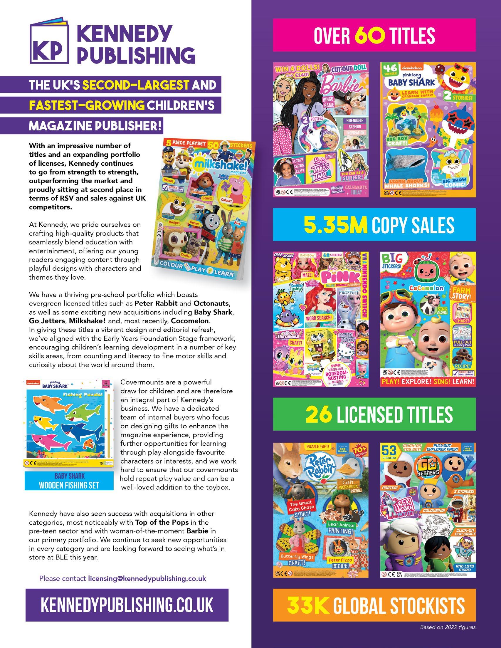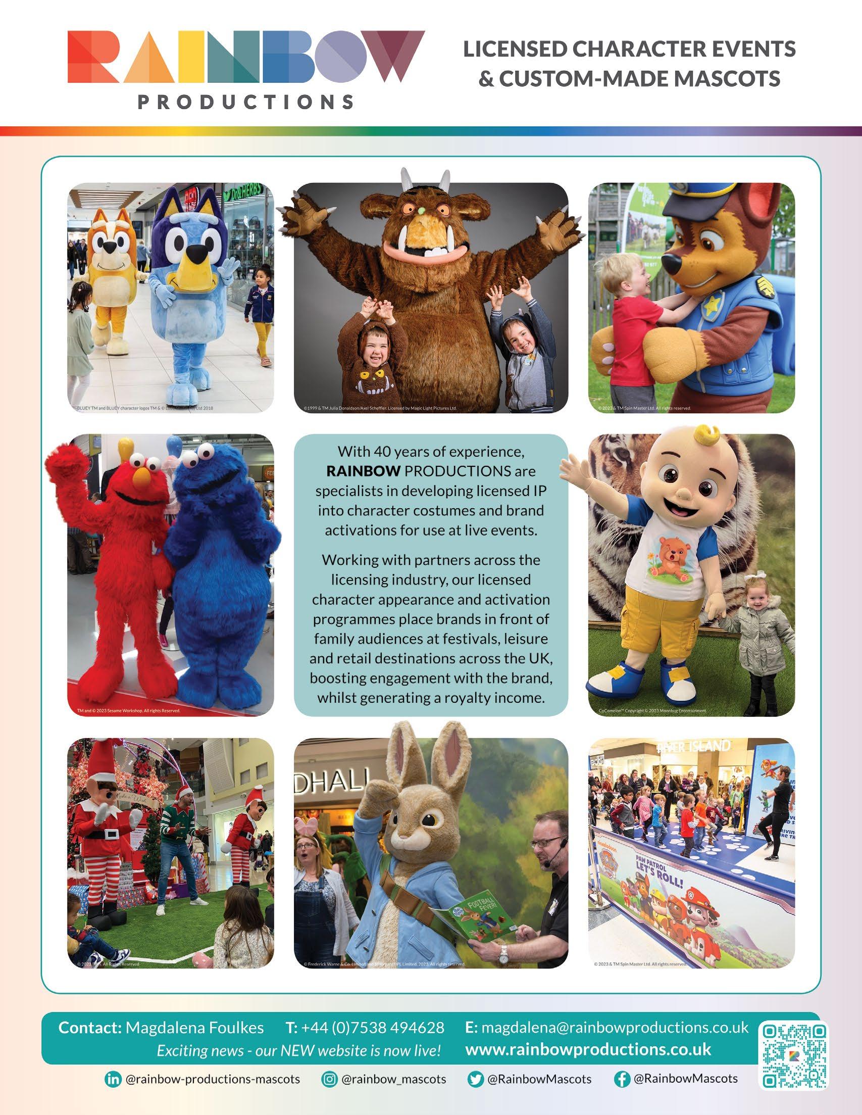 Regular Features Comment ....................................................................... 16 Global news 18 Cover Story: Rainbow ................................................. 82 Gary Pope Column .................................................... 162 Products of Change 166 Legally Speaking 172 What’s On ................................................................... 174 Europe Sarah & Duck celebrate 10 years 22 The World of Tara Duncan......................................... 30 Bulldog: Heading for a strong 2024 .......................... 38 Poetic Gem: 15 Years Strong 42 Brand Licensing Europe Preview ................ 44 Colour Our World with Miffy ................................... 70 TF1 Focus on LBE 74 Rainbow Productions: 40 Years ................................. 76 Kennedy Publishing - an Update ............................... 79 Licensing the European Space Agency 80 Santoro at Brand Licensing Europe.......................... 85 Toikido - Start-up to Major Brand ........................... 86 2024 - A New Era for Gormiti 88 Innovations and Experiences from Hasbro ............ 89 Bluey, Hey Duggee and more from BBC................. 90 Going All In with All3Media 95 Asterix the Gaulish Hero 96 85 Years of Beano ....................................................... 101 Mondo - Grisu and Gruffalo 102 Debut for HARI at BLE 103 Moonbug Explore New Opportunities ................. 106 Interivew: Penguin Ventures 108 Amscan: Making Life a Party! 109 Studio 100 Media in London ................................... 110 Millimages - an Update 112 Ready to Rock Boats! 113 Cooking a Feast with ChefClub.............................. 114 The World of Edutainment 115 Magic Light Celebrates 20 Years 116 MIPCOM Preview ...................................................... 120 Profile: Intercake 122 Profile: Carat 123 Nordic Rep Global Brands....................................... 124 Spotlight on Spain ...................................................... 125 Spain - a Multifaceted Marketplace 134 A Strong Licensing Connection .............................. 152 14 34 86 Asia Falcon’s Beyond in China ............................................ 32 Robocar Poli Around the World 142 Korea Character Fair Review .................................. 144 KOCCA at Brand Licensing Europe ...................... 146 Bigglz Mobile App 148 A.I. and Licensing in China 168 CEE Creating Success in Eastern Europe ...................... 154 North America Spin Master - Enduring Franchises 94 Afro Unicorn Gallops into London.......................... 98 Think Pink! 119 Zag at BLE 2023 126 New York Toy Fair - Preview ................................... 175 Middle East Cultural Sensitivies in Middle East Licensing 136 Shooting Stars: A MENA Champion....................... 138 Focus on Turkey’s Manufacturing Hub ................... 140 Global The Expanding World of Minecraft 34 2023 Global Licensing Study...................................... 36 The Squishmallows Sensation 72 Borderless Creativity from Banijay 100 Netflix - This is just the Beginning.......................... 104 Pokemon Drives Growth 111 Success in Nostalgia 118 The Growing World of LBE ..................................... 150 Roundtable Discussion 156 Key Trends Shaping European Fashion 164 104 175 94 90 Show Preview begins Page 44 NY TOY FAIR!