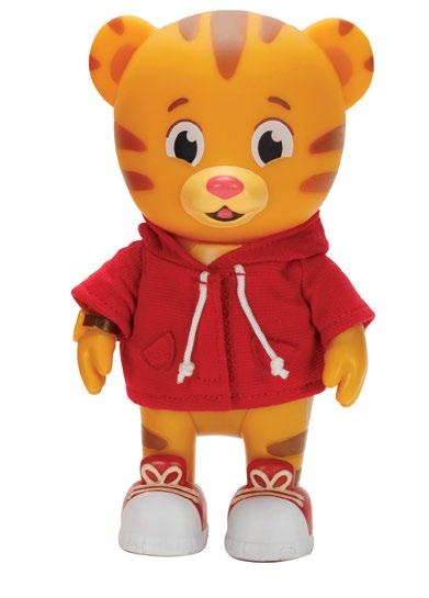 a 7-inch Daniel Tiger with moveable arms and legs is dressed in his classic red hoodie and sneakers along with his blue trolley printed pajama set and snuggly tiger-printed blue blanket.