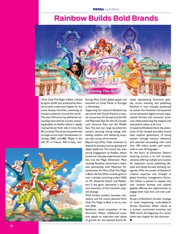 forcing Winx Club’s global appeal and launched on Canal Panda in Portugal in November. Supporting the relaunch, Rainbow has partnered with Giochi Preziosi as master toy partner for Europe and the UK, and Playmates Toys for the US, Canada, Latin America, Asia and the Middle East. The new toy range launched this autumn, securing strong listings with leading retailers and delivering buoyant sales across all territories. Beyond toys, Winx Club continues to expand its presence across gaming and digital platforms. The brand has seen strong engagement on Roblox, where immersive role-play experiences invite fans into the Magic Dimension. Most recently, Rainbow announced a major new partnership with Maximum Entertainment for Winx Club: The Magic Is Back, the first Winx console game in over a decade. Launching in April 2026 on PC, Nintendo Switch and PlayStation 5, the game represents a significant extension of the franchise’s playled strategy. With further product launches, activations and live events planned, Winx Club: The Magic Is Back is set to soar into 2026 Rainbow’s recent acquisition of the Geronimo Stilton intellectual property signals an important new phase of growth for the beloved brand. Al-