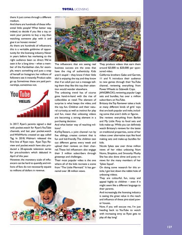 TOTAL LICENSING there. It just comes through a different medium. And there are hundreds of these influential little people! What better way, indeed, to decide if you like a toy, or want your parents to buy a toy, than watching someone play with it and give it an honest review? As there are hundreds of influencers, this is a veritable goldmine of opportunity for the licensing industry. Never in years before has marketing to the right audience been so direct. We’ve seen it for a long time – when a member of the Kardashian clan, for example, wears something and puts a snap of herself on Instagram, her millions of followers see it instantly. Product sales go up. Sometimes these are paid partnerships, sometimes not.