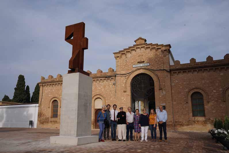 Nassio Bayarri juntament amb l'Alcalde i familiars de Leoncio Badía al costat de l'escultura a l'enterrador a les portes del cementeri municipal