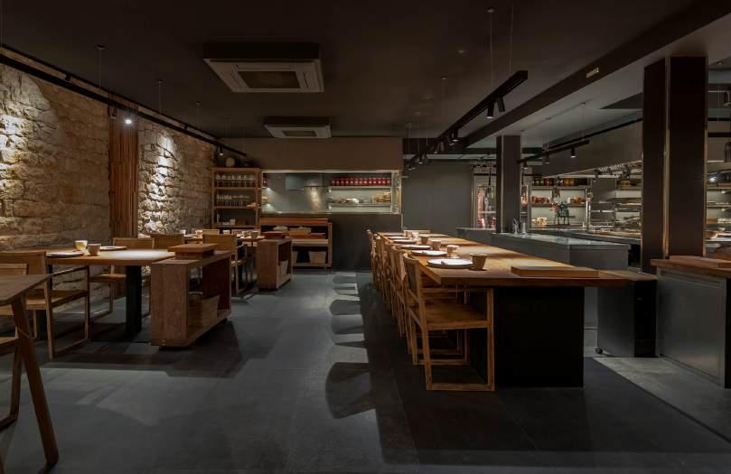 Michelin, el restaurant s’ha renovat per potenciar la seva identitat. El projecte fusiona la calidesa de la fusta i la sofisticació de la ceràmica amb els paviments de les prestigioses marques Mirage i Rosa Gres, en tons grisos i negres, per crear un efecte visual impactant i elegant. La fusta, importada del Japó, contribueix a l’autenticitat del local i combina amb la ceràmica tècnica que cobreix la resta del paviment de la sala principal.