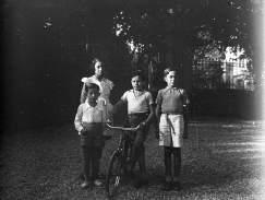 7. Bici i infància entre reixes de jardí. Quatre infants posen davant d’una bicicleta, en un de les amplies propietats on estiuejaven famílies benestants com els Recolons. Família Recolons / GREC