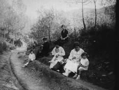 8. Grup de dones i infants reposen al marge d’un camí de bosc. La imatge transmet la tranquil·litat de les vacances de fa més de cent anys. Família Recolons / GREC