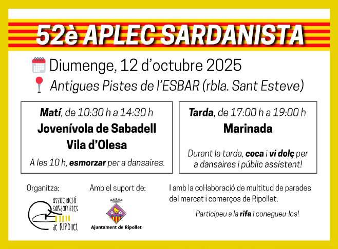 tuacions de Festa Major amb el seu tradicional Aplec Sardanista, que arriba ja a la seva 52a edició. La cita amb la colla sardanista serà diumenge 12 d’octubre durant tot el dia a les antigues pistes de l’ESBAR a la rambla Sant Esteve. A partir de les 10.30h hi haurà una exhibició de colles i una ballada conjunta amb la cobla Jovenívola de Sabadell i serà fins les 14.30 h. Abans, a les 10 h hi haurà esmorzar per a dansaires.