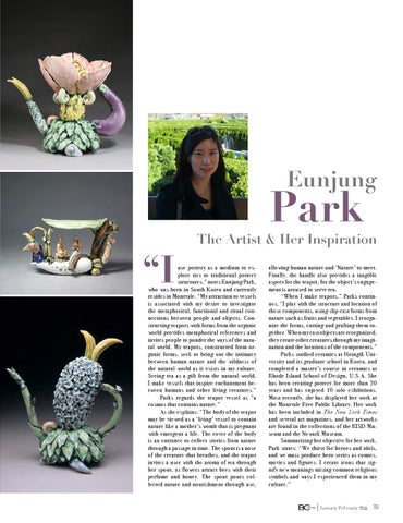 use pottery as a medium to explore ties to traditional pottery structures,” notes Eunjung Park, who was born in South Korea and currently resides in Montvale. “My attraction to vessels is associated with my desire to investigate the metaphorical, functional and ritual connections between people and objects. Constructing teapots with forms from the organic world provides metaphorical references and invites people to ponder the ways of the natural world. My teapots, constructed from organic forms, seek to bring out the intimacy between human nature and the wildness of the natural world as it exists in my culture. Seeing tea as a gift from the natural world, I make vessels that inspire enchantment between humans and other living creatures.” Parks regards the teapot vessel as “a cosmos that contains nature.” As she explains: “The body of the teapot may be viewed as a ‘living’ vessel to contain nature like a mother’s womb that is pregnant with emergent a life. The cover of the body is an entrance to collect stories from nature through a passage in time. The spout is a nose of the creature that breathes, and the teapot invites a user with the aroma of tea through her spout, as flowers attract bees with their perfume and honey. The spout pours collected nature and nourishment through use,