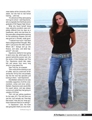 news station at the University of Delaware, but she had no real formal training… until now. “It’s almost as if they were paying me to go to school,” said Sepulveres, who is originally from Northvale and a graduate of Old Tappan High School. What she found herself doing now—almost by accident—was completely different from her days as a headhunter, which she had done for five years after college before working for the publishing company. But she was good at it. Actually, really good. “I realized how much I had liked that in college and then I thought, ‘Why didn’t I just pursue this after school? Where did I diverge and go into finance, and sales, and what happened?’” she said. Sepulveres started to love going to work every day, which gave her a special behind-the-scenes look into the minds of Alec Baldwin and Tina Fey. Sepulveres would take away bits and pieces from every long shoot in Long Island City. Take Tina Fey, for example. “She could just be drinking a cup of coffee, and you could look at her and be like ‘Oh my God, she probably has like the next two episodes just turning in there,’” said Sepulveres. Alec Baldwin, believe it or not, was incredibly supportive of all the crewmembers, extras and minor actors. Baldwin, Sepulveres said, would offer his expert advice, and was always curious as to what they had going on outside of 30 Rock. “He’s not just asking questions for the sake of it. The next time you see him, he’ll actually say ‘How was that show?’ How did your show go?’ How’s that book that you’re writing?’” In Sepulveres’ case, the book was going well, thank you very much. Continued on pg. 30