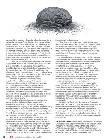 reduced the number of sports-related concussions. After the National Collegiate Athletic Association made the use of the head when tackling illegal in 1976, the annual number of head and neck injuries in football declined by about 50%. The required use of helmets in many contact sports and advances in helmet design also have resulted in fewer head injuries. Improved conditioning of young athletes, especially strengthening of neck muscles, may also help to prevent concussions. Although injury prevention begins with proper equipment, there is no such thing as a concussionproof helmet or mouth guard. Young athletes must be trained in safe sports techniques and how to follow the rules of the game. In addition, rule changes should be considered in sports where force is delivered head first. This not only promotes fair play, but also protects both participants. In order to get back into the game, most athletes will downplay their symptoms. Understanding the long-lasting consequences of repeat concussion is an important part of prevention. Several medical and sports organizations have recently developed concussion awareness programs for athletes, coaches and parents. These educational programs play a critical role in helping to recognize concussions and prevent repeat injury. If despite all precautions, a concussion does occur, the key to healing from a concussion is complete physical and mental rest. Reading, computer work, playing video games, even watching television are all activities that should be limited until all symptoms have resolved. This typically takes 7 to 10 days, although some people have symptoms for weeks or months after the injury. Once the patient is free of symptoms, the individual can gradually return to physical and mental activity. It is important to slowly return to daily activities because being symptom-free does not mean the brain injury has fully healed. Your doctor may recommend a step-by-step program: first add an activity, then monitor your symptoms. If symptoms do not return, the patient can continue 42