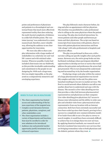 points and preferences of physicians and patients in a chronological and contextual frame that much more effectively represented reality than does reducing the multi-faceted complexity of diabetes to a slide full of bullet points. The ‘customer journey’ was understood in a more nuanced and, therefore, more valuable way, allowing the audience to see clear opportunities for innovation. We were also able to share complex information with a large number of stakeholders in a relatively raw and ‘real life’ context and with minimal reductionism. Wherever possible, Cooler had included client teams into our fieldwork, as this provides invaluable understanding and commitment to the people we are designing for. With such a large team, this was simply impossible, so the play acted as a comparatively immersive and enveloping experience.