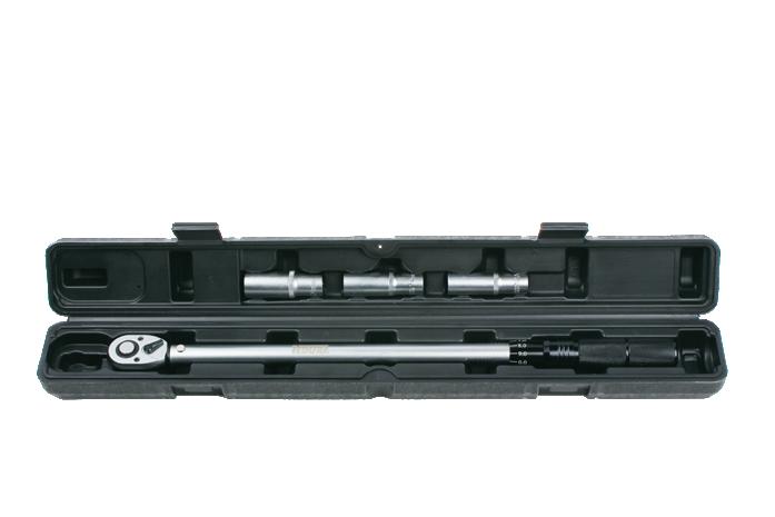En acier trempé avec carré entraînement ½“ -comprenant 3 douilles ½“ de taille 17, 19 et 21 mm en acier au chromevanadium. Réglage simple et précis du couple nécessaire. L’atteinte du couple réglé est signalée par un clic. Précision déclenchement +/-4% (en usine) du couple réglé. Réglable gauche-droite.