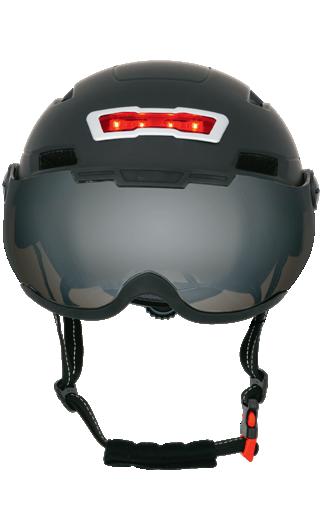 Un casque de style urbain, moderne avec une visière et des feux avant et arrière LED intégrés. Le casque est homologué EN1078 et donc certifié pour une utilisation sur les routes suisses. Important: l’éclairage ne se substitue pas à l’éclairage du vélo.